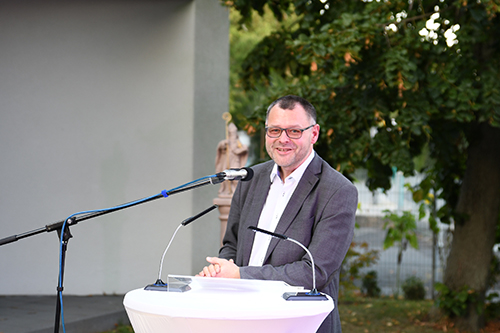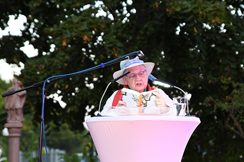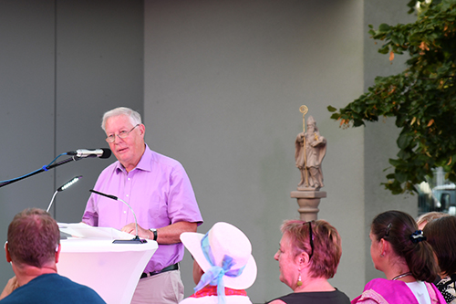Gut besucht war die vierte Veranstaltung der Reihe Literatur am Kirchplatz am Freitag, 23. August, vor der Heilig Kreuz-Kirche im Frankfurter Stadtteil Bergen-Enkheim. Pfarrer Uwe Hahner begrüßte die Gäste „im südlichsten Zipfel des Bistums Fulda“ und wies auf den Initiator der Reihe, den 2012 verstorbenen Pfarrer Alfons Gerhardt, hin. Der hatte Literatur am Kirchplatz in Hünfeld begründet.