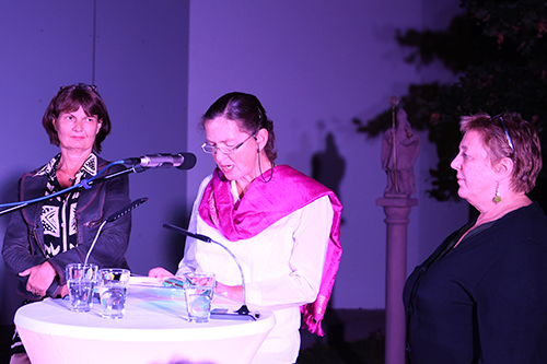 Zuletzt traten die „Oberleserinnen“, wie Schledt sagte, ans Pult. Die evangelische Pfarrerin Karola Wehmeier, Bergen-Enkheims Ortsvorsteherin Renate Müller-Friese und Petra Scheschonka vom Mediacampus wechselten sich ab, um von drei Frauenschicksalen – das der Inderin Smita, einer Unberührbaren; der Sizilianerin Giulia, Tochter eines Perückenfabrikanten, und der erfolgreichen kanadischen Anwältin Sarah, die an Krebs erkrankt – zu lesen. Der Roman Der Zopf von Laetitia Colombani, 2018 bei S. Fischer publiziert, berührte.