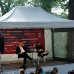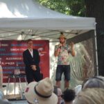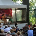 Bereits am frühen Nachmittag begrüßten Tom Kraushaar und Tom Müller zahlreiche Gäste, die trotz der tropischen Hitze von 35 Grad den Weg an den Wannsee gefunden hatten. Klett-Cotta Verleger Tom Kraushaar erwähnte, dass der Verlag bereits 2011 im LCB zu Gast war (wir berichteten). „Heute steht der kleinere, aber schillerndere Tropen Verlag im Mittelpunkt“, sagte er und erinnerte an die 24-jährige Geschichte des Verlags, der 1996 von Michael Zöllner, der gestern ebenfalls unter den Gästen war, in Düsseldorf gegründet wurde und seit 2007 Imprint von Klett-Cotta ist. Anfang dieses Jahres zog der Tropen Verlag unter der Leitung von Tom Müller in die Hauptstadt (wir berichteten über das „Berlin-Opening“). Tom Müller wurde in seiner Begrüßung politisch: Wir alle müssten mehr tun, uns mehr engagieren – gegen Diskriminierung, für den Klimaschutz und für das Zusammenwachsen von Ost und West, forderte er. „Bücher können dabei hilfreich sein.“