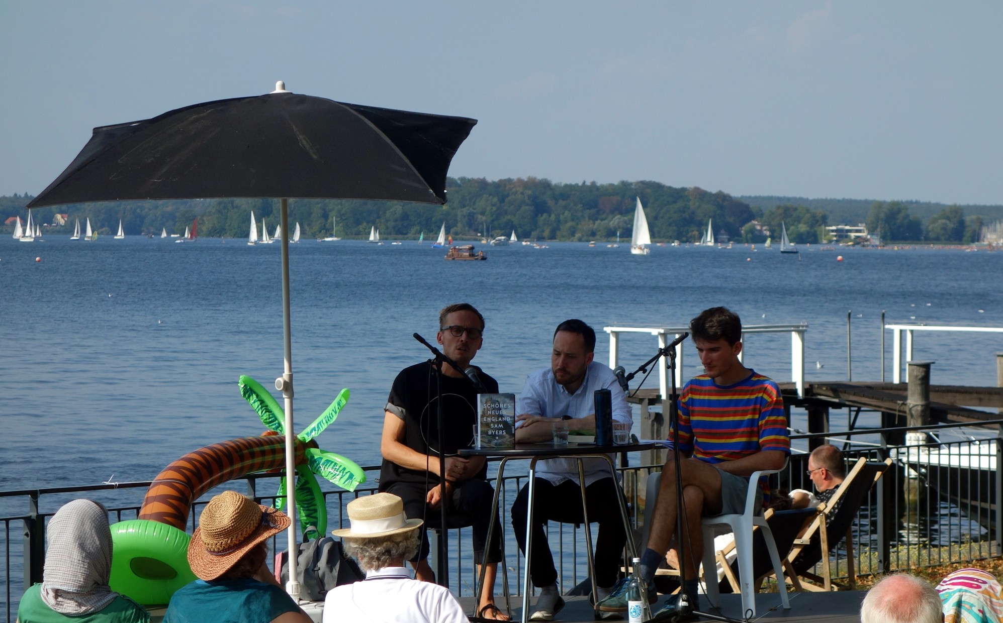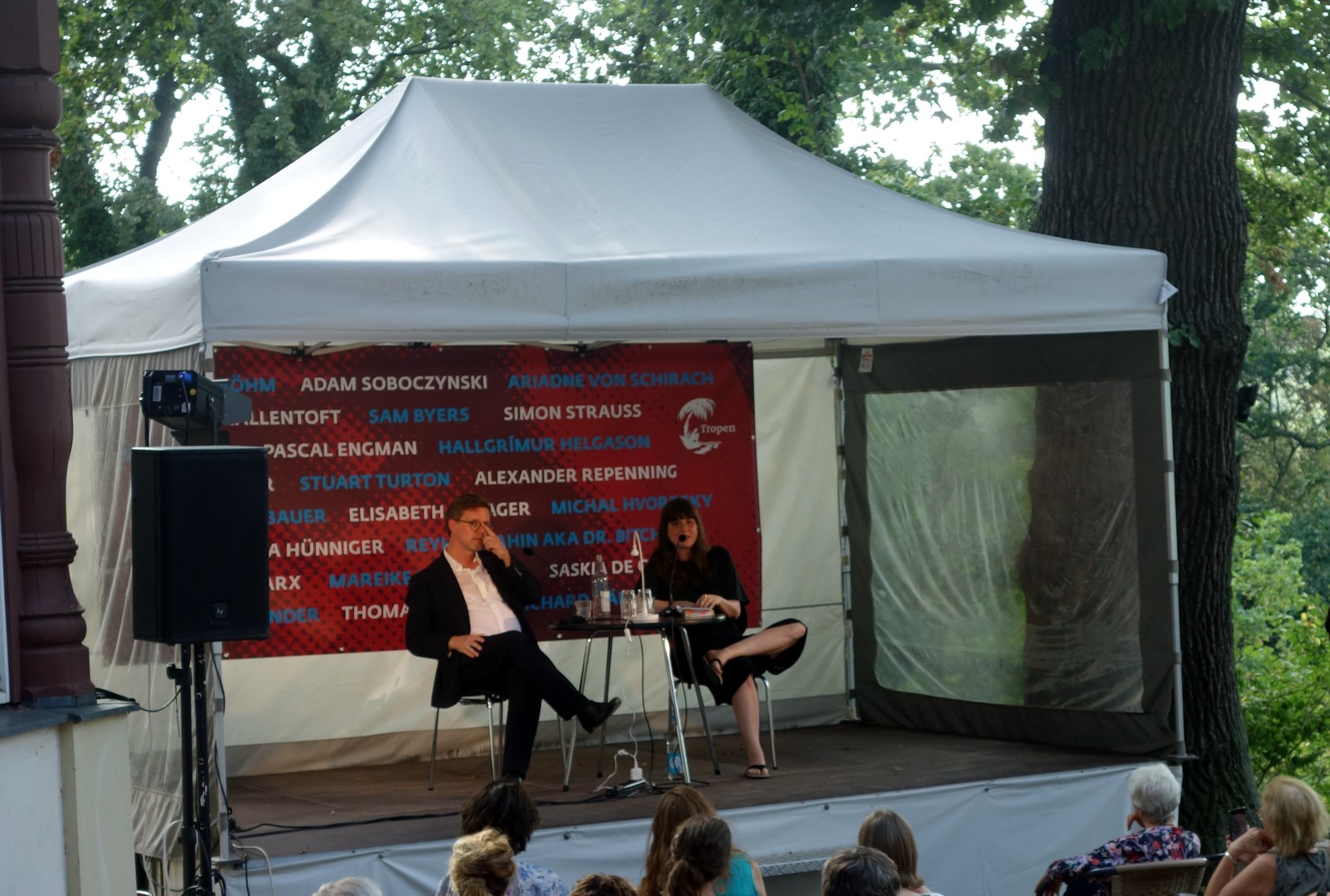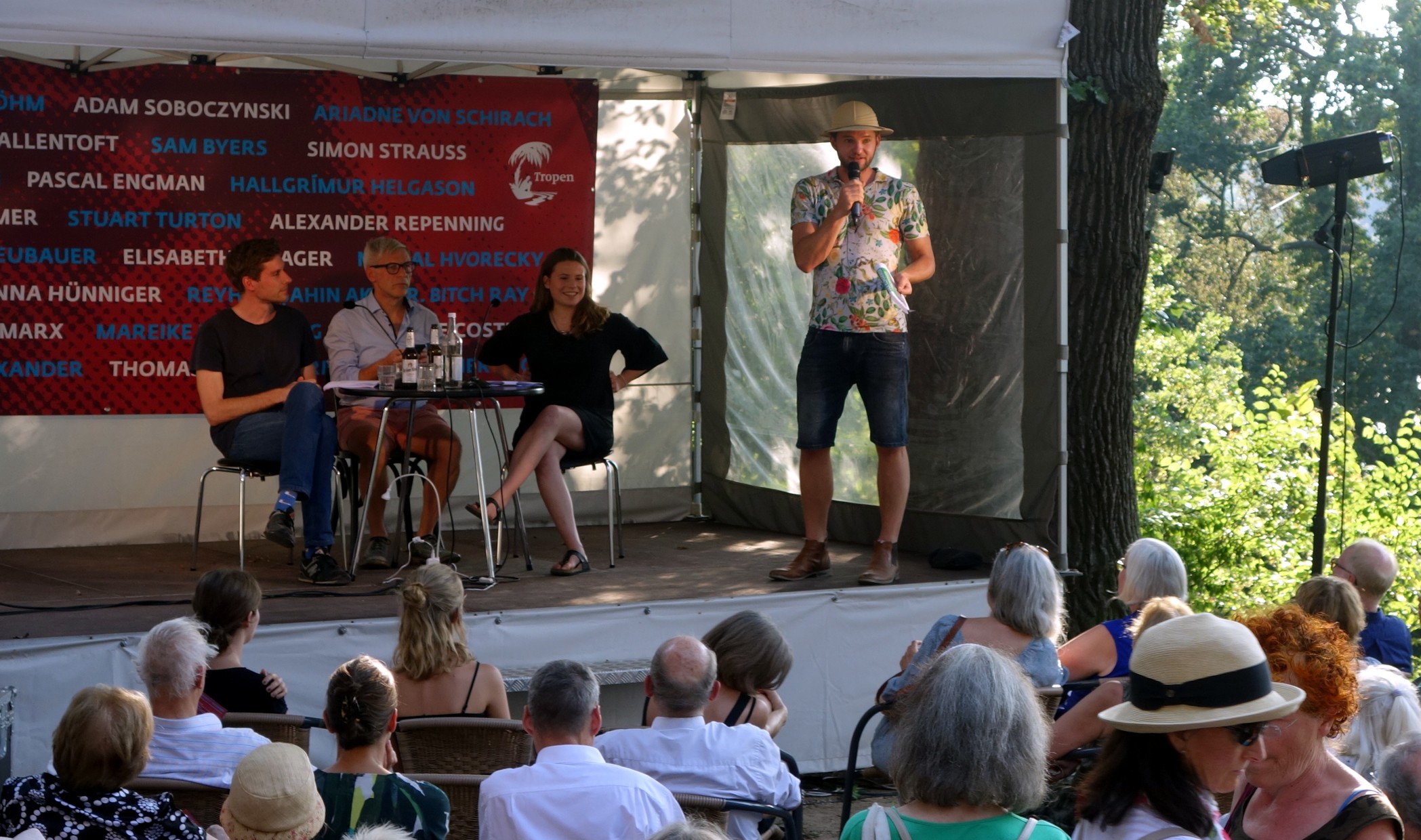 Bereits am frühen Nachmittag begrüßten Tom Kraushaar und Tom Müller zahlreiche Gäste, die trotz der tropischen Hitze von 35 Grad den Weg an den Wannsee gefunden hatten. Klett-Cotta Verleger Tom Kraushaar erwähnte, dass der Verlag bereits 2011 im LCB zu Gast war (wir berichteten). „Heute steht der kleinere, aber schillerndere Tropen Verlag im Mittelpunkt“, sagte er und erinnerte an die 24-jährige Geschichte des Verlags, der 1996 von Michael Zöllner, der gestern ebenfalls unter den Gästen war, in Düsseldorf gegründet wurde und seit 2007 Imprint von Klett-Cotta ist. Anfang dieses Jahres zog der Tropen Verlag unter der Leitung von Tom Müller in die Hauptstadt (wir berichteten über das „Berlin-Opening“). Tom Müller wurde in seiner Begrüßung politisch: Wir alle müssten mehr tun, uns mehr engagieren – gegen Diskriminierung, für den Klimaschutz und für das Zusammenwachsen von Ost und West, forderte er. „Bücher können dabei hilfreich sein.“