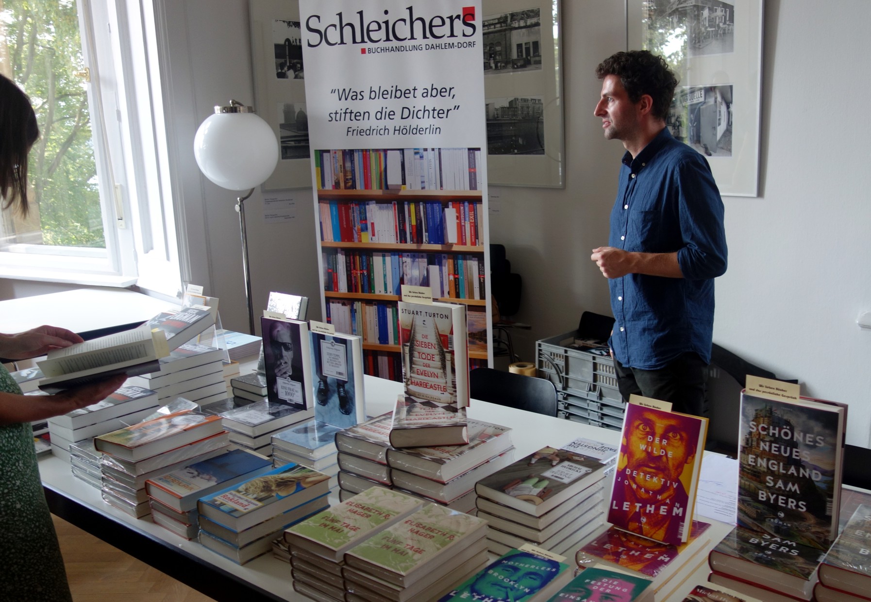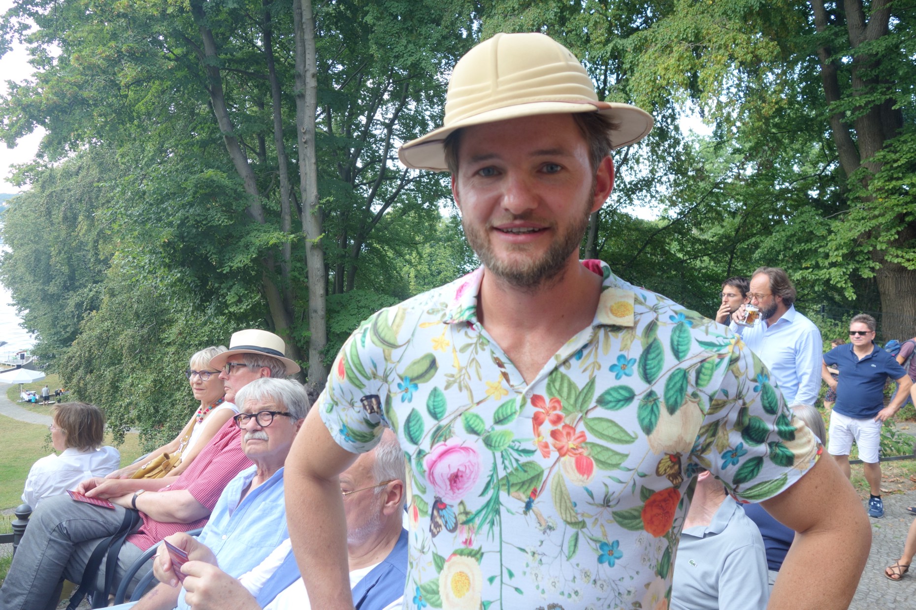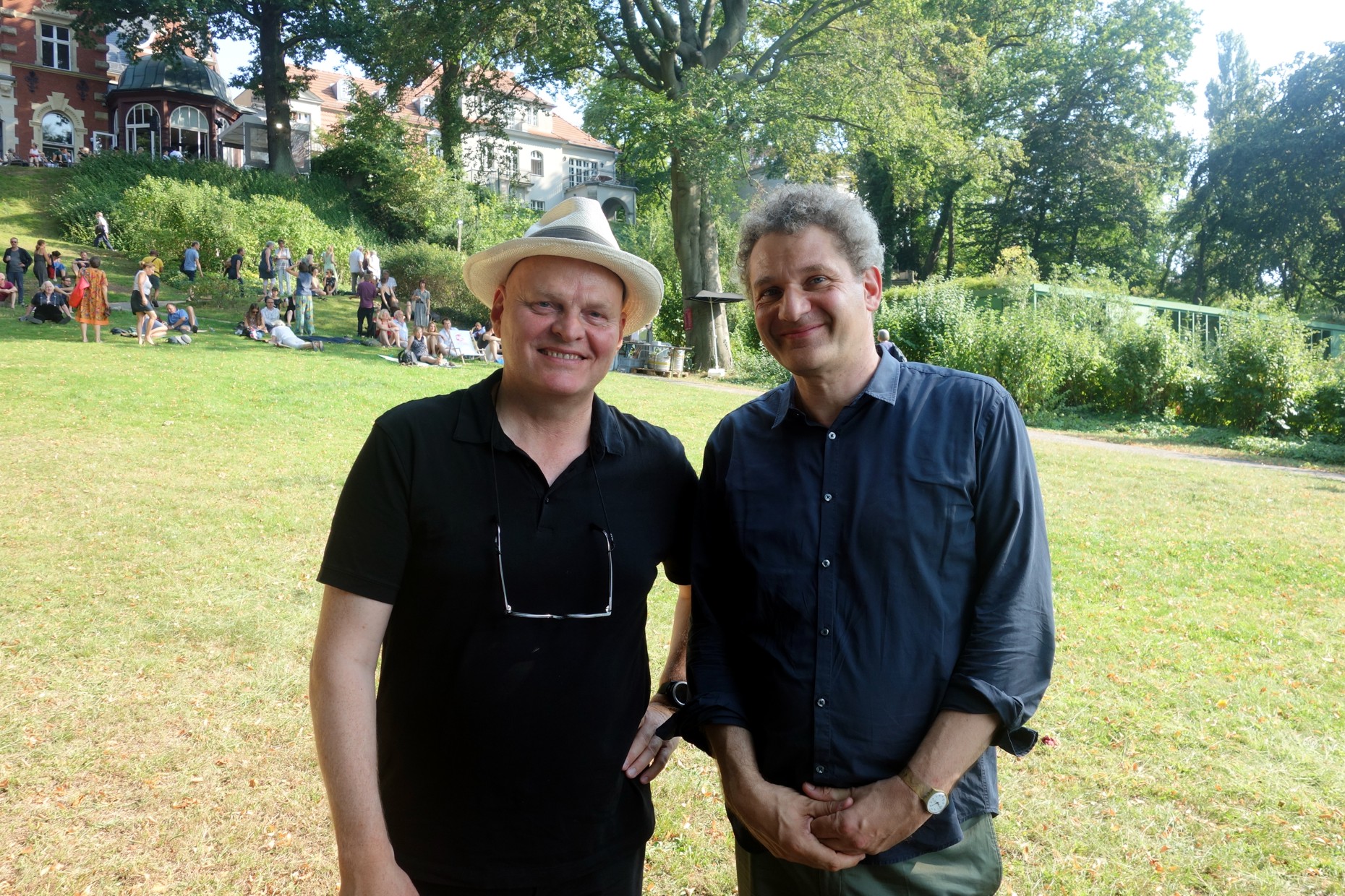 Bereits am frühen Nachmittag begrüßten Tom Kraushaar und Tom Müller zahlreiche Gäste, die trotz der tropischen Hitze von 35 Grad den Weg an den Wannsee gefunden hatten. Klett-Cotta Verleger Tom Kraushaar erwähnte, dass der Verlag bereits 2011 im LCB zu Gast war (wir berichteten). „Heute steht der kleinere, aber schillerndere Tropen Verlag im Mittelpunkt“, sagte er und erinnerte an die 24-jährige Geschichte des Verlags, der 1996 von Michael Zöllner, der gestern ebenfalls unter den Gästen war, in Düsseldorf gegründet wurde und seit 2007 Imprint von Klett-Cotta ist. Anfang dieses Jahres zog der Tropen Verlag unter der Leitung von Tom Müller in die Hauptstadt (wir berichteten über das „Berlin-Opening“). Tom Müller wurde in seiner Begrüßung politisch: Wir alle müssten mehr tun, uns mehr engagieren – gegen Diskriminierung, für den Klimaschutz und für das Zusammenwachsen von Ost und West, forderte er. „Bücher können dabei hilfreich sein.“