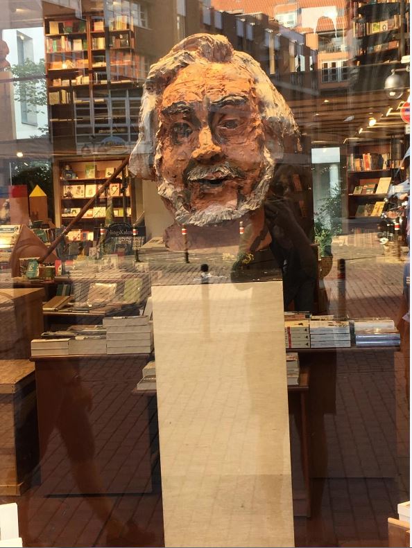 Wir wollen Mut machen und Lust, mit der Warengruppe Religion mehr Umsatz zu erzielen. Auch in Zusammenarbeit mit kirchlichen Einrichtungen vor Ort lassen sich Menschen in die Buchhandlung locken. Gerade ist z.B. dieser Kopf im Schaufenster der Buchhandlung an der Marktkirche zu sehen, für ein Projekt des Diakonischen Werks der evangelischen Kirche mit Obdachlosen: „Kunst trotz(t) Ausgrenzung“