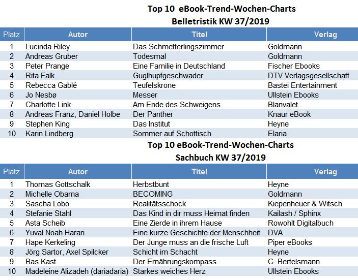 Die Top 10 ebook Trend Charts in Belletristik und Sachbuch werden wöchentlich durch media control GmbH ermittelt und in den eBook-Shops zur Verfügung gestellt: