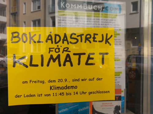Über den Newsletter KommBuch.com gelangte diese E-Mail an die Abonnenten: Die Buchhandlung Land in Sicht in Frankfurt beteiligt sich am heutigen weltweiten Streik für das Klima und informiert die Kunden mit einem Plakat im Schaufenster über die temporäre Schließung.