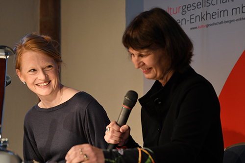 Müller-Friese wollte zunächst wissen, wie Kampmann die Mitteilung über die Auszeichnung als Stadtschreiberin von Bergen-Enkheim aufgenommen hatte. „Ich war gerade in Eile und musste zum Zug. Deshalb habe ich die Mail nur flüchtig gelesen. In der Bahn habe ich mich beim genauen Hinsehen gefreut und gewundert, dass die Nachricht um 2.30 Uhr abgeschickt wurde“, sagte die Autorin. „Jurysitzungen dauern manchmal lang“, bemerkte Müller-Friese dazu.