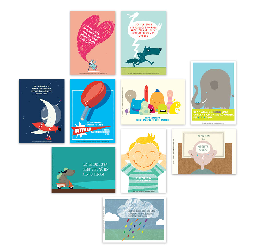 Das bedeutet konkret: Auf der Frankfurter Buchmesse werden erstmals zehn Postkarten präsentiert, auf denen jeweils ein Satz aus einem Kinderbuch zu lesen ist, illustrativ gestaltet von Dirk Uhlenbrock vom Büro erste liga in Essen. Es sind Sätze, die man sich gleich an den Kühlschrank hängen möchte oder einem anderen Menschen schicken möchte, weil sie so gut sind. Jeder einzelne Satz möchte neugierig machen auf das ganze Buch – und auf das, was die Kinderliteratur sonst noch zu bieten hat.