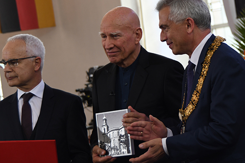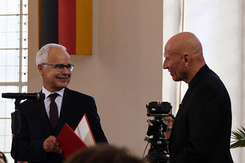 Anschließend verlas Heinrich Riethmüller die Urkunde des Friedenspreises und übergab sie feierlich an Sebastião Salgado, die Gäste in der Paulskirche waren aufgestanden. Der Preis ist mit 25.000 Euro dotiert.