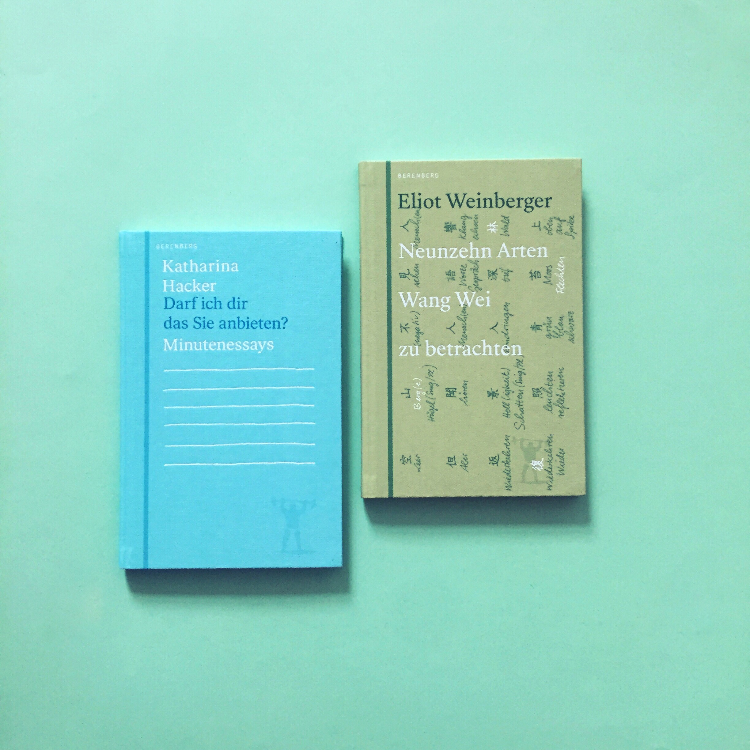 Der Berenberg Verlag startet eine neue Reihe: Mit Katharina Hackers Minutenessays unter dem Titel Darf ich dir das Sie anbieten? und Eliot Weinbergers Neunzehn Arten Wang Wei zu betrachten liegen die ersten beiden Bücher der Reihe vor, die in kleinem Format, in Leinen gebunden, aber sanft biegsam erscheinen.