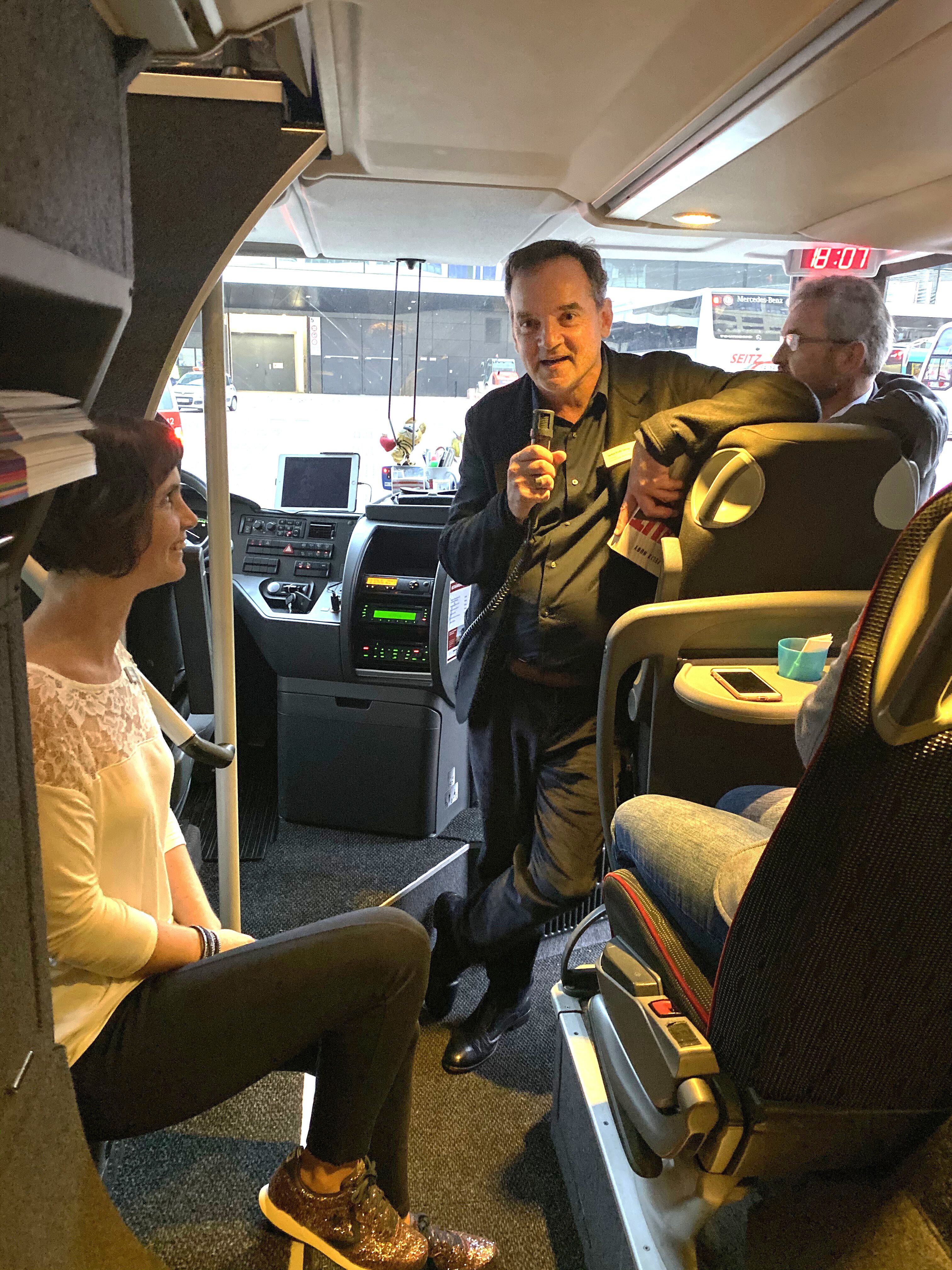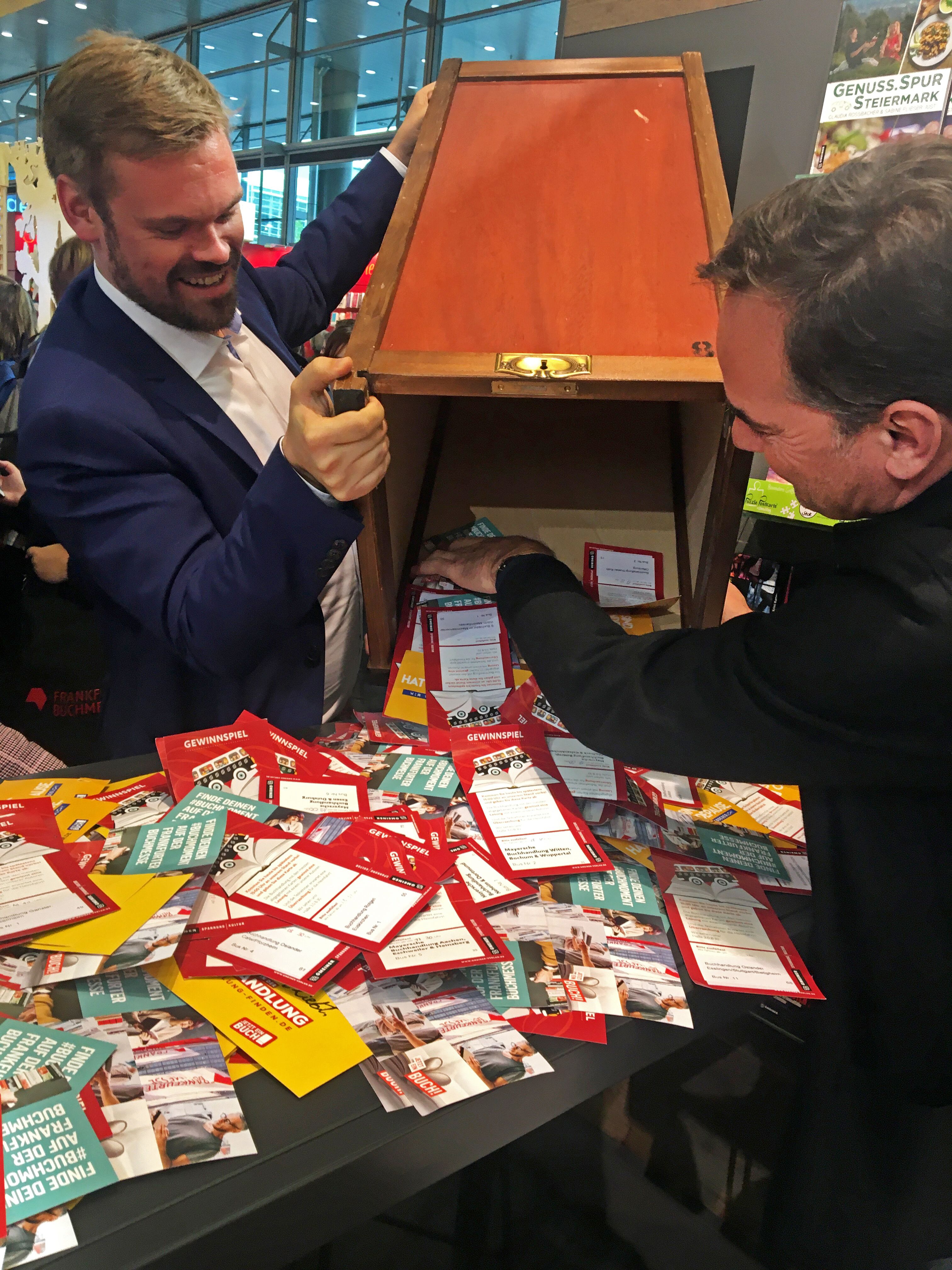 Dort fand auch am späten Nachmittag die Live-Auszählung der abgegebenen Karten statt. Die Altstadt Buchhandlung Wittlich darf sich nun auf eine exklusive Lesung mit einem Wunschautor freuen. Dazu sponsert der Gmeiner-Verlag ein Catering im Wert von 300 Euro. Mit tatkräftiger Unterstützung der Frankfurter Buchmesse bestiegen die glücklichen Gewinner – unter dem Applaus der wartenden Menge – am Abend als erste ihren Bus, von denen umgerechnet 93,4 Prozent ihre Karte bis 15.00 Uhr eingeworfen hatten. Verleger Armin Gmeiner und Vertriebs- und Marketingleiter Jochen Große Entrup erwarteten darin bereits die Buchhändlerin Alexandra Marbach und die Mitreisenden zur Siegerehrung. Zur Verkürzung der Rückreisezeit wurde ihnen erlesener Wein sowie Lesestoff aus dem Gmeiner-Verlag überreicht. Nicht zuletzt der Erfolg aus dem Jahr 2017 hatte die Nachfrage so beflügelt, dass die Wittlicher eigens einen größeren Bus anmieten mussten, um dem Interesse der Kunden gerecht zu werden.