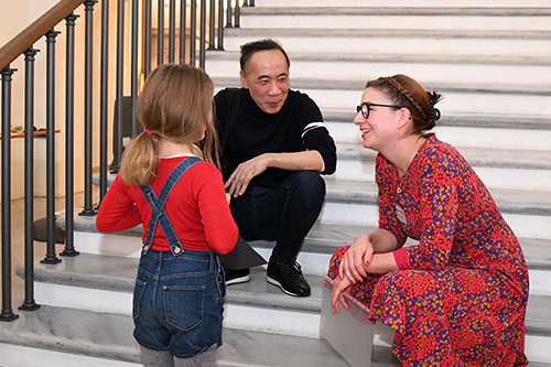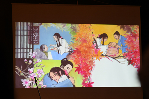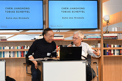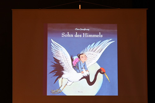 Während im Obergeschoss Markus Weber eine mehrsprachige Kamishibai-Lesung veranstaltete, stellten im Lesesaal Chen Jianghong und sein Übersetzer Tobias Scheffel das Buch Sohn des Himmels vor, die Illustrationen wurden auf einer Leinwand gezeigt. „Ich war kürzlich in Italien und Russland unterwegs. Nun bin ich in Deutschland. Leider spreche ich all diese Sprachen nicht“, entschuldigte sich der in China geborene und seit 30 Jahren in Frankreich lebende Chen Jianghong. Scheffel übersetzte und fügte hinzu: „Hauptsache, du kannst zeichnen. Das finde ich viel wichtiger.“ Applaus im Saal.