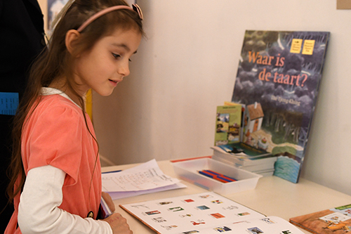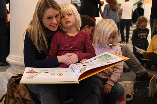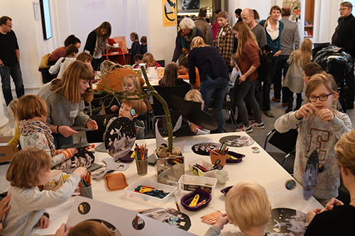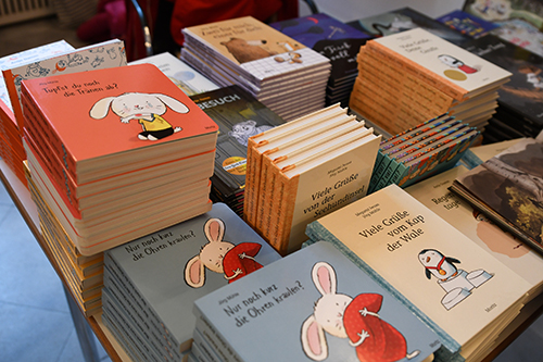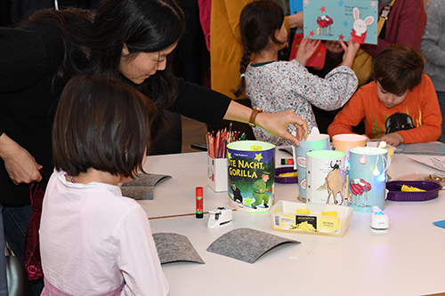 Antje Damm philosophierte inzwischen im Obergeschoss mit den Kindern, im Foyer waren die Basteltische gut besucht, manche Eltern und Kinder hatten sich zurückgezogen und blätterten in den Büchern – 380 sind es in den 25 Jahren insgesamt, die der Moritz Verlag veröffentlicht hat.