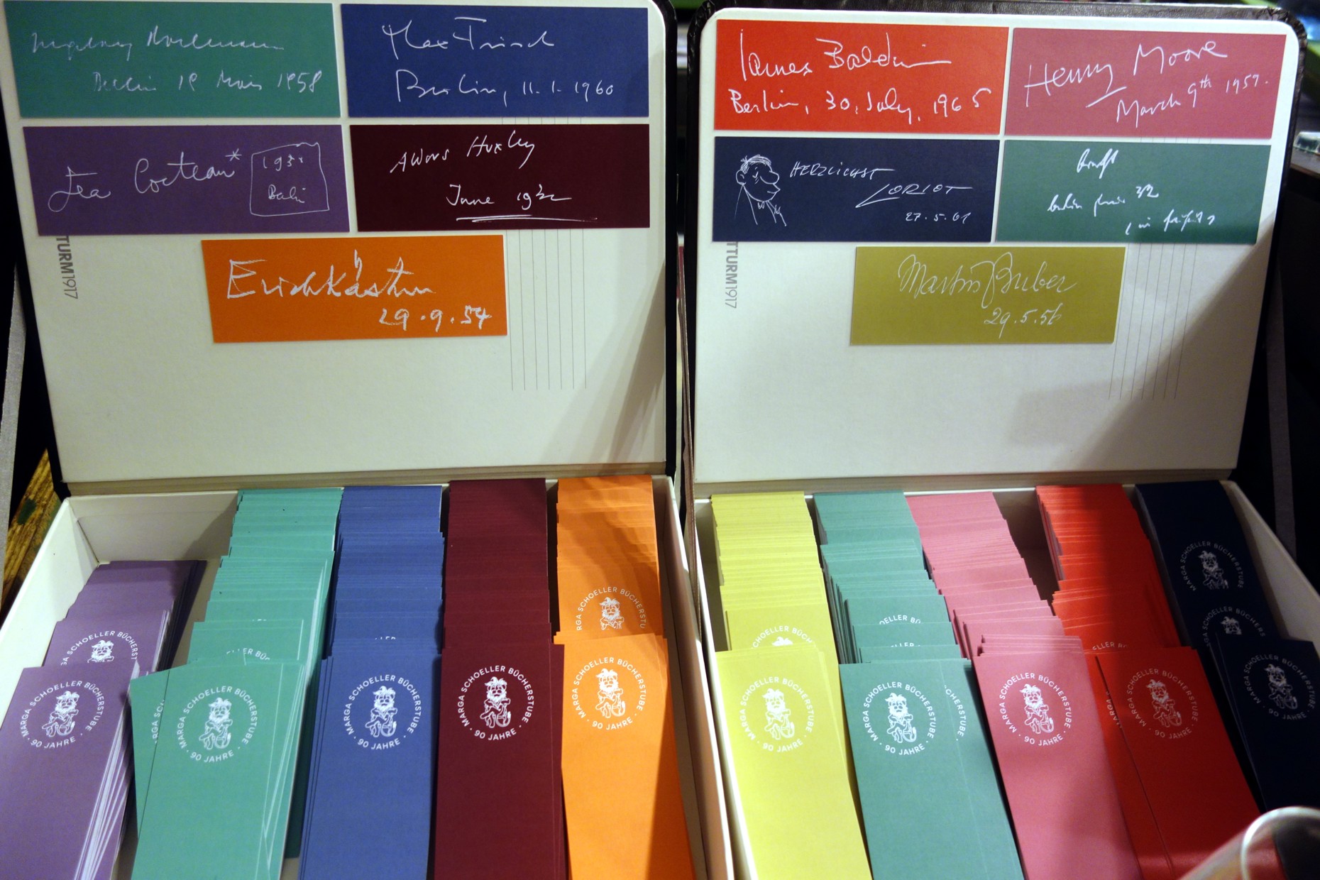 Die Gäste stießen jedenfalls bis tief in die Nacht auf den Erfolg und die Zukunft der Buchhandlung an. „Sehr schön!“, „Wunderbar!“ kommentierten sie den gelungen Abend, der zeigte, dass man bei Marga Schoeller nicht nur etwas vom Bücherverkaufen, sondern auch von Kundenpflege versteht. Und vom Feiern sowieso. Zum Jubiläum ließ die Buchhandlung kunterbunte Lesezeichen mit Autografen aus ihrem Gästebuch drucken: von James Baldwin, Martin Buber, Erich Kästner, Aldous Huxley und anderen. Und als Geschenk konnten die Gäste die schön gestaltete Festschrift 90 Jahre Marga Schoeller Bücherstube mit nach Hause nehmen. Enthalten sind die Geschichte der Buchhandlung mit zahlreichen Fotos von 1929 bis heute, Erinnerungen von Kunden, Auszüge aus dem Gästebuch und aus Romanen, in denen sich Autorinnen und Autoren über die Marga Schoeller Bücherstube geäußert haben, sowie Briefe. Mascha Kaléko schrieb 1956 an Heinrich Maria Ledig-Rowohlt „In Berlin hatte nur Frau Schöller das Buch [Das lyrische Stenogrammheft] intelligent ausgestellt, nämlich aufgeschlagen, sodass die Leute in der Passage das lesen konnten.“