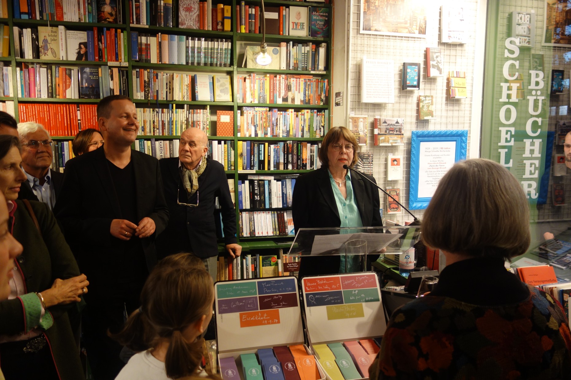 Geschäftsführerin Ruth Klinkenberg begrüßte das Publikum und erwähnte, dass auch Enkel und Urenkel von Marga Schoeller unter den Gästen waren. Außerdem stellte sie Florian Schoeller, einen Verwandten der Gründerin, vor. Der Unternehmer hatte vor zwei Jahren alle Geschäftsanteile der GmbH übernommen. „Damit ist die Buchhandlung in dritter Generation im Familienbesitz“, so Ruth Klinkenberg, die heute die Geschäfte allein führt, nachdem Marga Schoellers Sohn Thomas Rodig vor Kurzem aus der Geschäftsführung ausgeschieden ist.