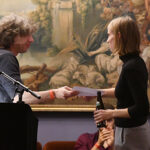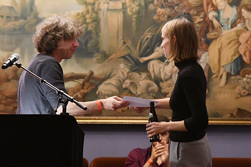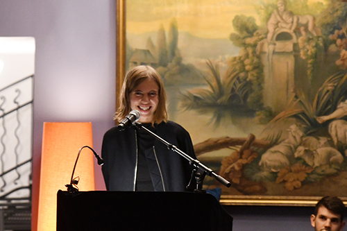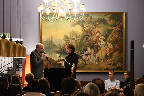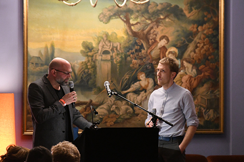 Werner stellte die Nominierten jeweils kurz im Gespräch vor. Als erste Shortlist-Autorin las Annina Haab aus Wo du bist, ihr folgte Nils Langhans mit einer Passage aus Alabama. Den ersten Block beendete der erste Preisträger Luca Manuel Kieser mit Von einer, die aus Namen ein Geheimnis macht. Rumpelstilzchen? Oder: Die Höhle. Kieser erzählt darin ein Frauenleben von der unmittelbaren Nachkriegszeit bis fast zur Gegenwart.