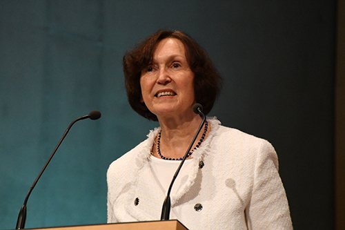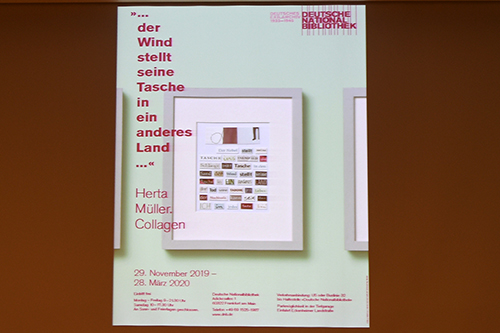 Die Direktorin der Deutschen Nationalbibliothek Frankfurt, Ute Schwens, begrüßte die vielen Zuhörer im Saal: „114 Collagen von Herta Müller, ergänzt mit Fotografien von Barbara Klemm und Arbeitsgegenständen der Autorin, sind in einer Sonderschau zur Dauerausstellung des Deutschen Exilarchivs 1933 bis 1945 bis zum 28. März 2020 zu sehen. Viele Collagen wurden noch nie veröffentlicht.“ Mit dieser Schau werde ein Brücke zwischen Vergangenheit und Gegenwart geschlagen. Außerdem werden erstmals die Lesesäle mit Installationen zur Sonderausstellung einbezogen. Zur Exposition ist kann sich der Besucher einen Audioguide mit der Stimme von Herta Müller ausleihen.