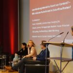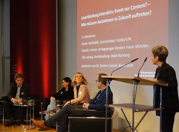 Zur Frage „Wie müssen AutorInnen in Zukunft auftreten?“ diskutierten Hauke Hückstädt (Leiter des Literaturhauses Frankfurt/M.), Claudia Limmer (Marketing-Gesamtleiterin der Verlagsgruppe Random House) und Lilly Ludwig (Buchhändlerin und Bloggerin, Buchhandlung Jakob, Nürnberg) unter der Moderation von Dr. Torsten Casimir (Chefredakteur Börsenblatt).