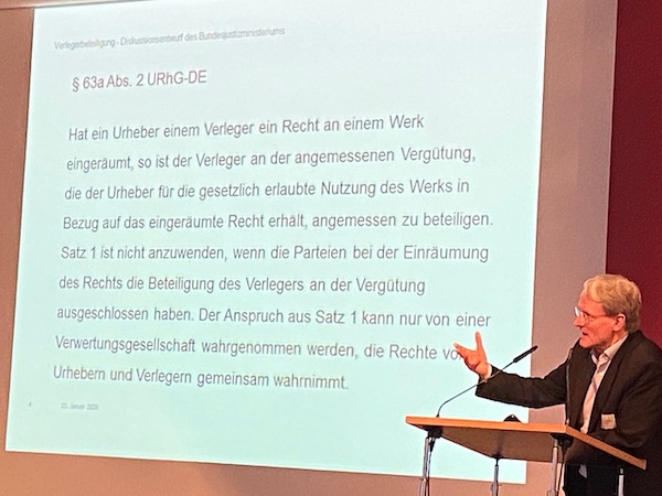 Es liegt jetzt ein Diskussionsentwurf zu Neuregelung der Verlegerbeteiligung an den VG Wort-Erlösen vor. Das ist noch kein Gesetzentwurf, sondern ein Weg, um die Debatte in Gang zu setzen. Zwar herrsche unisono die Meinung, dass es grundsätzlich eine Verlegerbeteiligung geben solle, aber der rote Faden des Misstrauens gegenüber den Verlagen, der sich auch durch alle Urheberrechtsdiskussionen zieht, ist auch hier zu sehen: etwa indem man festlegen will, dass die Autoren grundsätzlich mindestens 2/3 der Erlöse erhalten sollen.