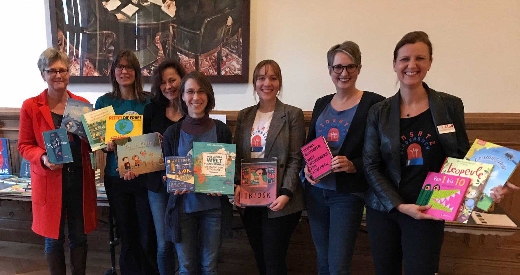 In T-Shirts der Branchenaktion EinSatz Kinderbuch präsentierten die Pressesprecherinnen der Acht auf einen Streich-Verlage heute ihre Frühjahrsnovitäten im Berliner Ullstein-Haus. „Wenn eine gut konzipierte Aktion nachhaltig sein soll, muss sie immer wieder und auch auf regionaler Ebene sichtbar sein“, sagt Gerstenberg-Pressesprecherin Andrea Deyerling-Baier. „Weil zu unserer Pressebörse neben Journalisten, Bloggern und Lesungsveranstaltern auch engagierte Buchhändler kommen, die die originellen EinSatz Kinderbuch-Postkarten gern an ihre Kunden verschenken, konnten wir sie auf diese Weise an Erst- oder Nachbestellungen erinnern.“