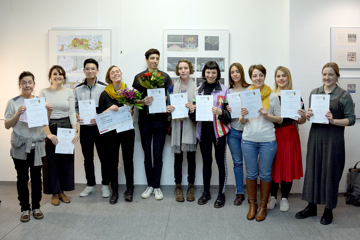 Neben den beiden Gewinner*innen (auf dem Foto mit Blumenstrauß) wählte die Jury außerdem zehn weitere Projekte in die offizielle Ausstellung, die am selben Abend eröffnet wurde. Dazu zählen Werke der Künstler*innen Iwona Lapo, Anja Fell, Zeynep Oba, Beata Zurawska & Csenge Kindli, Catherine Kuhlmann, Nina Restle, Maria Gabriela Picon Quintero, Annalena Glimm, Hung Duy Kieu und Paula Runiewicz. Ihre Arbeiten können in den Räumen der AID besichtigt werden.