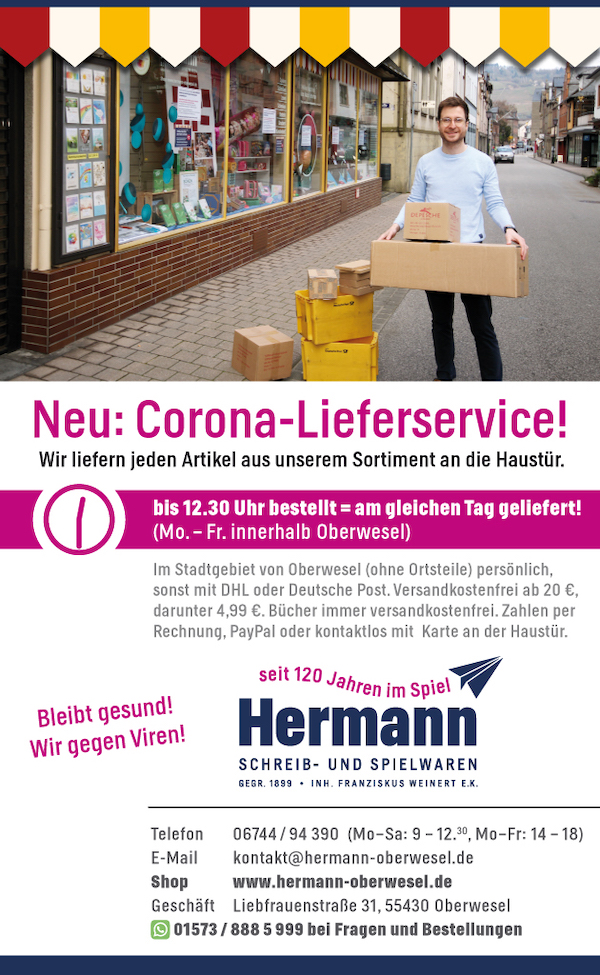 * Die Idee dazu kam aus dem Spielwarenhandel. Der kreative Händler, der seine Kunden ganz selbstverständlich beliefert und hier auf dem Plakat zu sehen ist, heißt Franziskus Weinert. Der GF der Firma Schreib- und Spielwaren Hermann in Oberwesel/Rheinland Pfalz hat uns hier ein Foto seines Corona-Service-Plakates gemailt, es it gerade fertig geworden. (Hier ein aktueller Bericht über ihn —- als Fundgrube für Ihre Aktionen?)