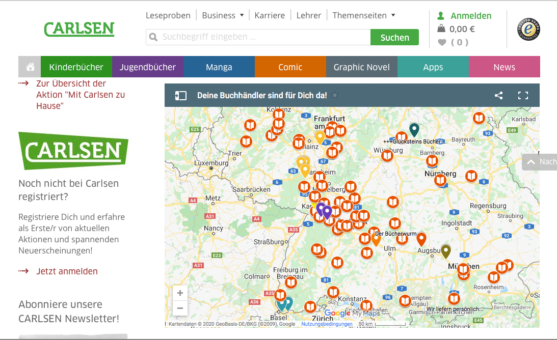 In diese interaktive Karte über Google Maps können sich Buchhandlungen aus dem gesamten Bundesgebiet eintragen und Informationen über ihren Service und besondere Aktionen hinterlegen. EndkundInnen haben so die Möglichkeit schnell herauszufinden, wo sich die nächstgelegene Buchhandlung befindet, wie bestellt werden kann und ob geliefert wird oder eine Abholmöglichkeit eingerichtet ist. Der Eintrag ist kostenlos. Wer teilnehmen möchte, schickt eine E-Mail an ruth.aigner@carlsen.de und erhält eine Einladung zur Registrierung.