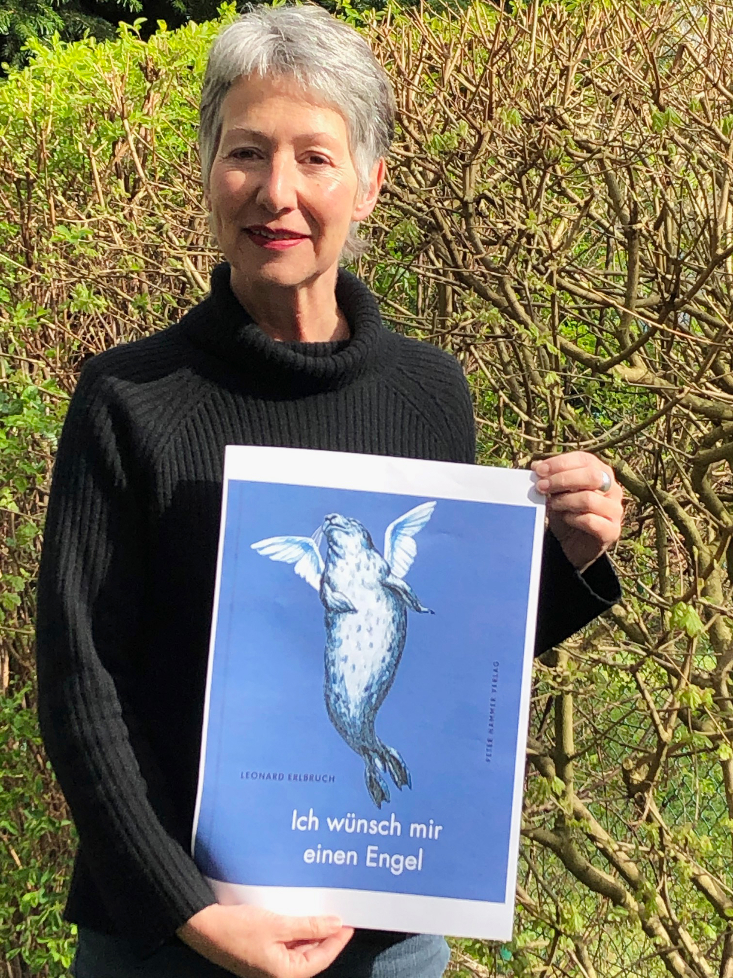 Monika Bilstein, Geschäftsführerin Peter Hammer Verlag: „Ein ganz besonderes Buch wird erscheinen, das sich zwischen Kunst- und Geschenkbuch bewegt. Leonard Erlbruch, mit dem wir ja schon verschiedene Kinderbücher gemacht haben, hat seit 1993 seiner Mutter zu jedem Geburtstag und Weihnachtsfest einen Engel geschenkt. In ganz unterschiedlichen Techniken sind sie entstanden und zu einer wunderbaren Sammlung geflügelter Figuren und höchst originellem Ausdruck schöpferischer Kraft geworden. Da finden sich neben Menschen allerhand Tiere, – Bären, Pferde, Hunde, Nashörner, allen sind Flügel gewachsen, wie auch der Robbe, die auf dem Titelbild zu sehen ist. Ich wünsch mir einen Engel wird ein grandioses, sehr persönliches Buch, das mir sehr am Herzen liegt. Andreas Platthaus hat einen wunderbaren Text dazu geschrieben.“