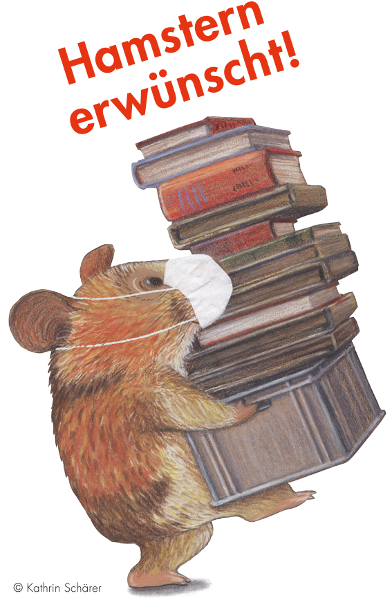 Der Atlantis Verlag bedankt sich mit einem Motiv der Illustratorin Kathrin Schärer bei allen BuchhändlerInnen, die auch in dieser besonderen Situation Wege finden, Bücher zu den KundInnen zu bringen. Jetzt kann der Buchhandel einen Bücherhamster mit BZ-Kiste und Bücherstapel sowie dem Slogan „Hamstern erwünscht!“ runterladen, um seine Lieferleistungen während des Lockdowns anzuzeigen: https://www.ofv.ch/kinderbuch/lesefutter-hamstern/