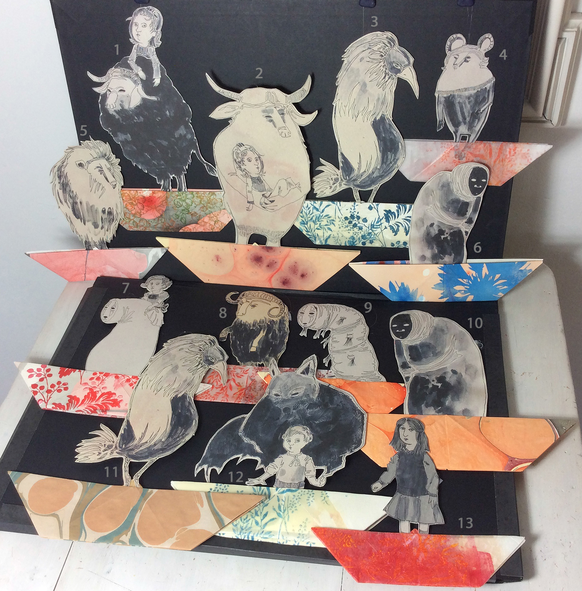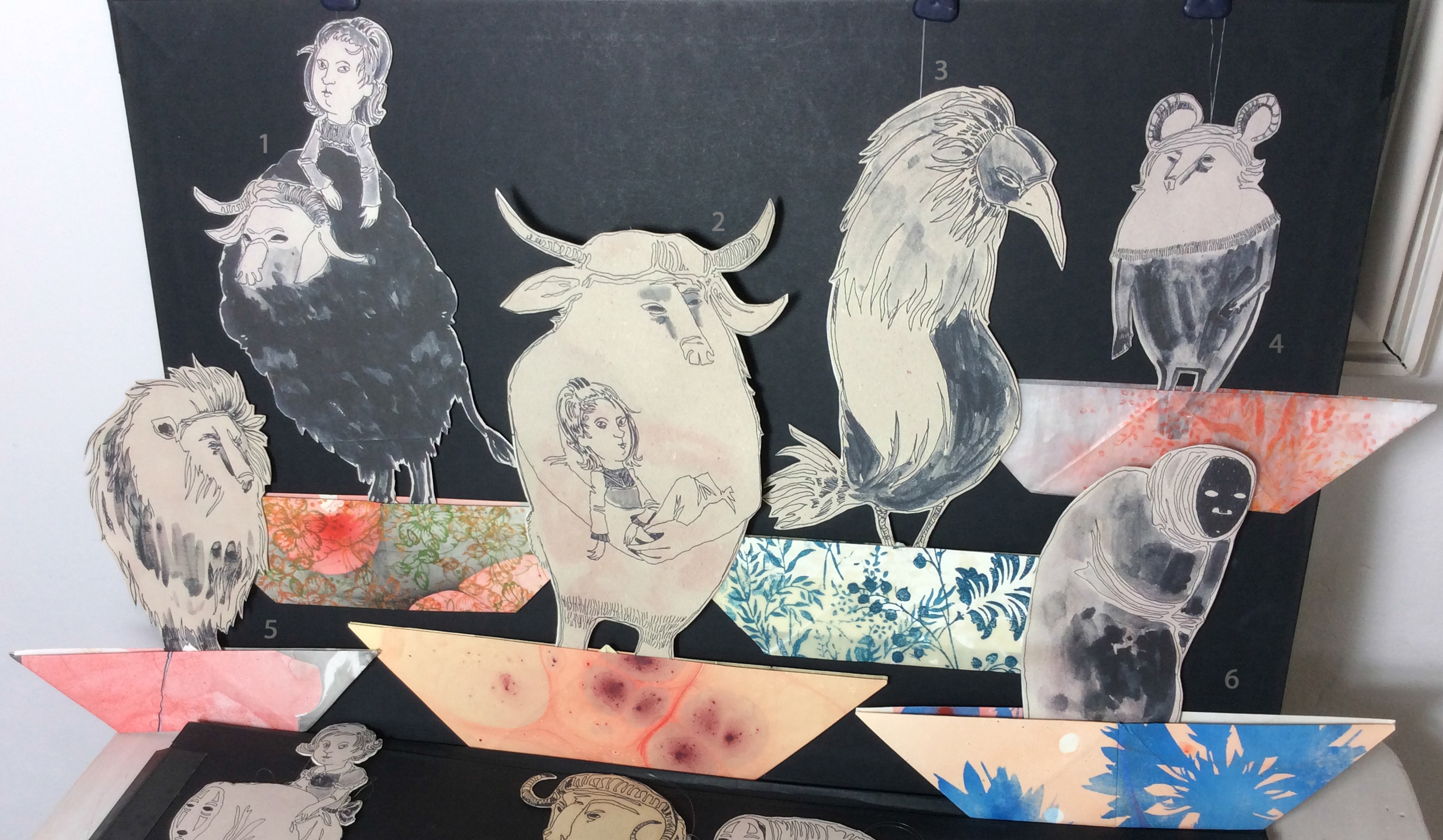 Die Serie „Boote“ besteht aus 13 Papier-Booten mit Insassen, die vorne und hinten bedruckt sind. Die Boote sind aus selber gemachten Drucken und selbst marmoriertem Papier gefaltet. Alle haben einen dünnen Nylonfaden, an dem sie in den Raum, oder an die Wand gehängt werden können. Die größeren Boote ca. 30 cm x 30 cm – 34 cm x 34 cm (1, 2, 3, 10, 11, 12) kosten 45 Euro incl. 7% MwSt. + 7,50 Euro versicherter Versandt (DHL). Die kleineren Boote ca. 20 cm x 25 cm – 28 cm x 25 cm (4, 5, 6, 7, 8, 9, 13) gibt es für 35 Euro incl. 7% MwSt. + 7,50 Euro versicherter Versandt (DHL). Auch sie sind zu bestellen bei SchmidSophie@gmx.de.