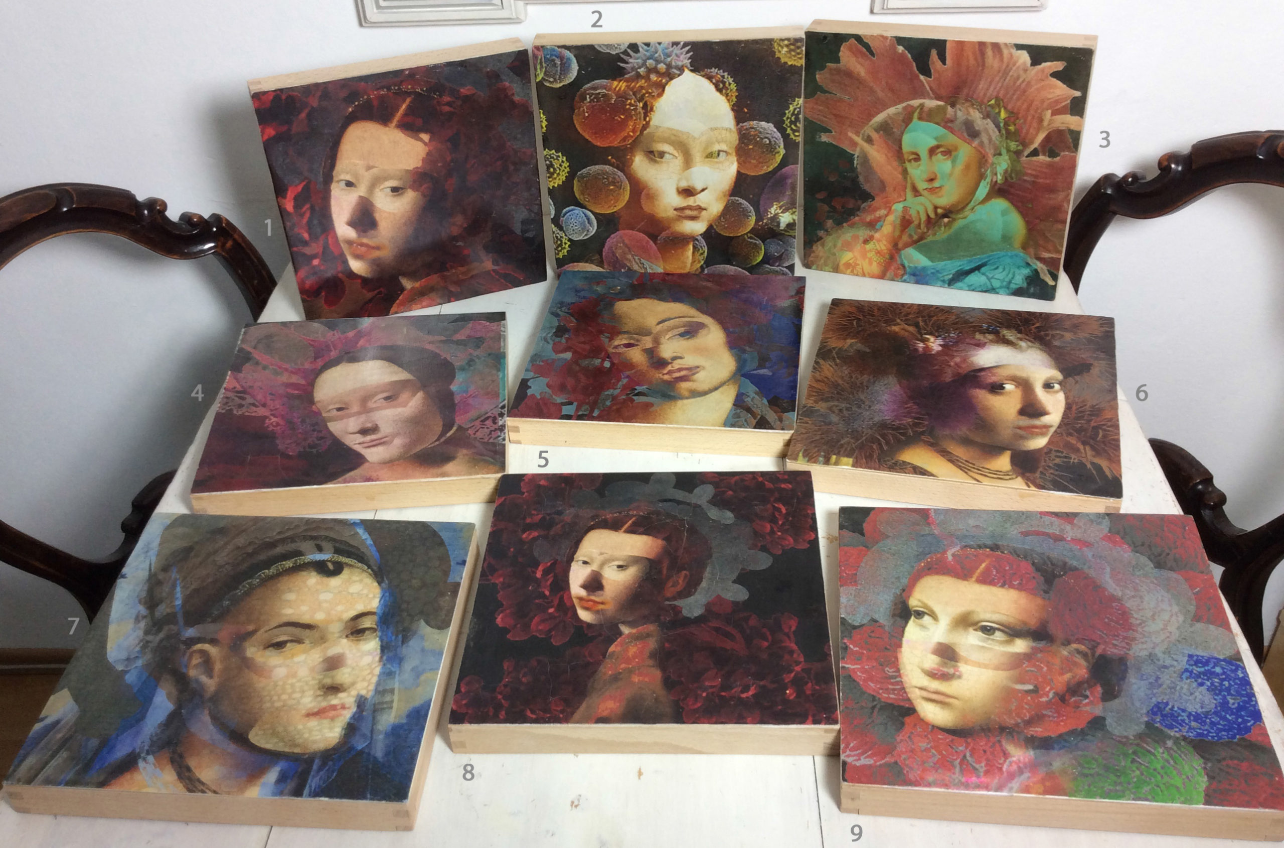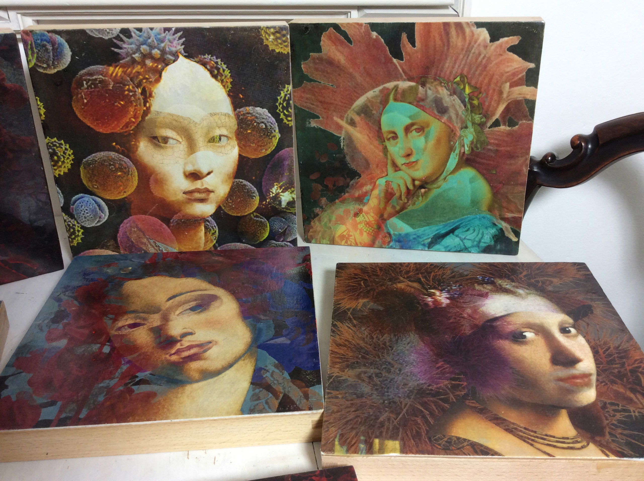 Die Serie „Gemischte Damen“ besteht aus digitalen Collagen, die auf 25 cm x 25 cm x 3 cm große Holzkörper transferiert wurden. Eine etwas fummelige Handarbeit, die sich loht, weil sich die Damen besser auf Holz als auf Papier machen. Für 80 Euro incl. 7% MwSt. + 7,50 Euro versicherter Versandt (DHL) kann man sie bei SchmidSophie@gmx.debestellen. Unter schmidsophie.de gibt es alle Motive der Serie zu sehen.