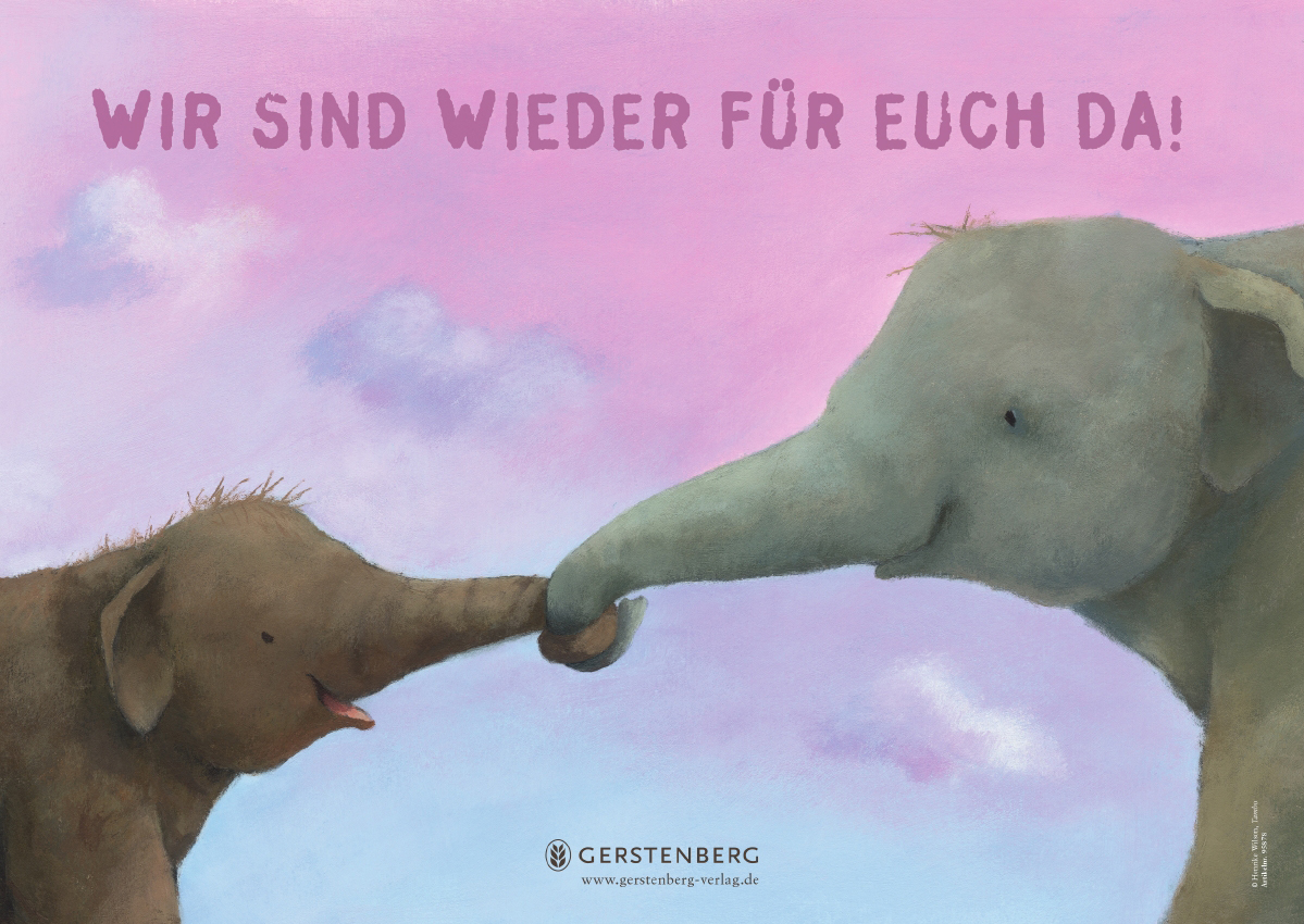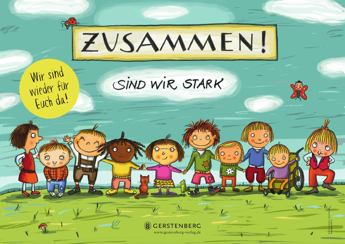 Für einen gelungenen Start nach der langen Ladenschließung begrüßt der Gerstenberg Verlag BuchhändlerInnen mit einem kostenlosen Willkommen-zurück-Dekopaket im Gesamtwert von über 150 Euro. Denn: „Zusammen sind wir stark“ – so auch das Motto des beiliegenden Plakats von Daniela Kulot.