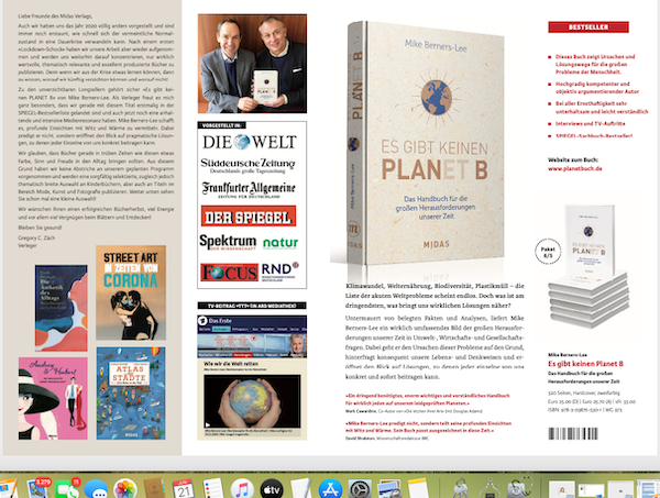 Zu den unverzichtbaren Longsellern gehört sicher »Es gibt keinen PLANET B« von Mike Berners-Lee. Als Verleger freut es mich ganz besonders, dass wir gerade mit diesem Titel erstmalig in der SPIEGEL-Bestsellerliste gelandet sind und auch jetzt noch eine anhaltende und intensive Medienresonanz haben. Mike Berners-Lee schafft es, profunde Einsichten mit Witz und Wärme zu vermitteln. Dabei predigt er nicht, sondern eröffnet den Blick auf pragmatische Lösungen, zu denen jeder Einzelne von uns konkret beitragen kann.