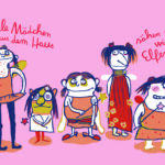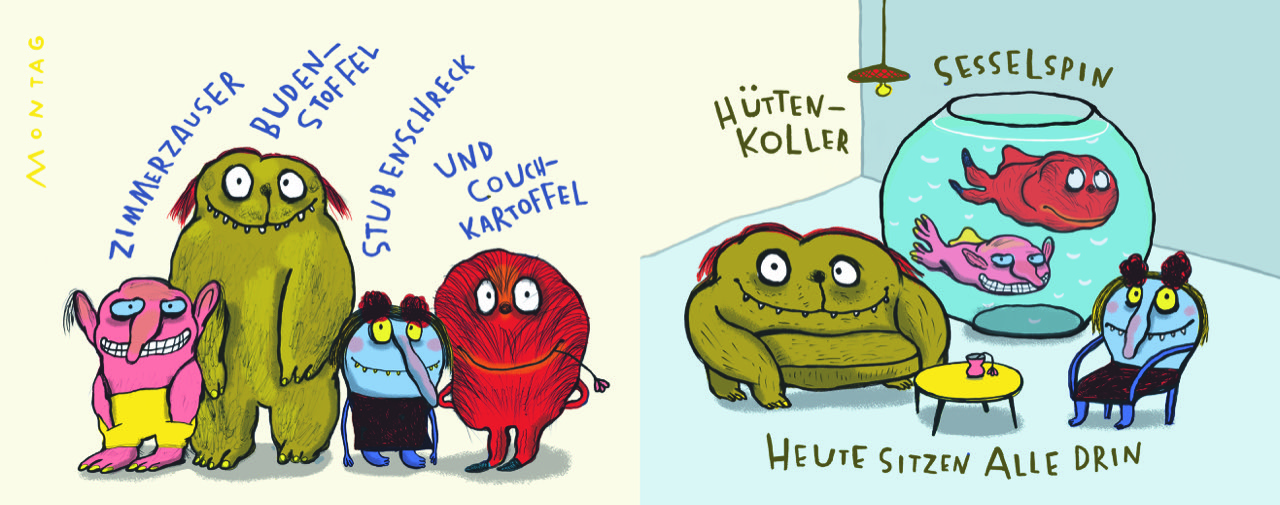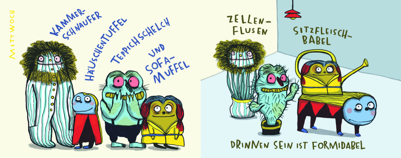 Das Pappbilderbuch Eine Woche drin ist 2020 in limitierter Auflage erschienen. Preis: 11 Euro, wahlweise mit Stubenhocker-Maske Größe S: 20 Euro, jeweils zzgl. Versandkosten. Bisher gab es Eine Woche drin als Ebook, nun auch als Pappe. Und darum geht es: Immer nur drin – ist der unfreiwillige Hausarrest nicht ein Traum für jede Couchkartoffel? Keine Kita, keine Schule, kein Büro, schön daheimbleiben, herumknorzen, im Bett oder auf dem Sofa liegen. Kinder und ihre Eltern wechseln in neue Daseinsformen: Budenstoffel und Heimpantoffel, Katenhocker und Scheunenstrolch, Kissenschrat und Polstermolch … Am Montag und Dienstag macht das Spaß. Am Mittwoch ist es formidabel. Am Donnerstag, naja, kriegen wir es noch irgendwie hin. Am Freitag macht sich üble Stimmung breit, am Samstag hält uns nur noch die Hoffnung auf bessere Zeiten aufrecht – aber am Sonntag ist Schluss mit Hochhausrappel und Goldfischtick: Irgendwann gehen zum Glück die Türen wieder auf! Nadia Budde hat ein witziges Bilderbuch zum Ausnahmezustand gezeichnet: Eine Woche drin macht gute Laune und stimmt uns optimistisch. Für die Zeit drinnen – und die Zeit danach. Hier noch zwei Doppelseiten: