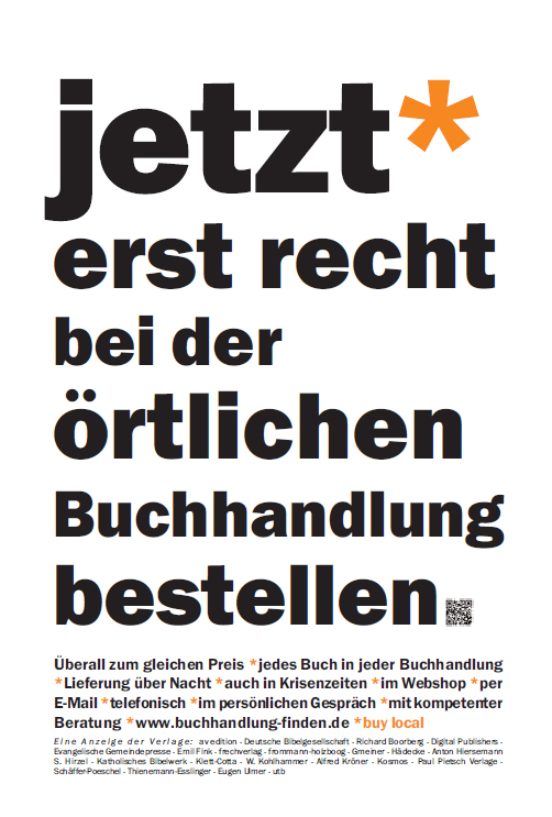 Eine schöne Initiative, die aus der Stuttgarter Verlegerrunde entstanden ist: Insgesamt 22 Verlage haben am vergangenen Samstag in der Stuttgarter Zeitung eine Anzeige geschaltet, die zur Unterstützung des lokalen Buchhandels aufruft: „Jetzt erst recht bei der örtlichen Buchhandlung bestellen“, lautet der Slogan. Unterschrieben haben: av edition . Deutsche Bibelgesellschaft . Richard Boorberg . Digital Publishers . Evangelische Gemeindepresse . Emil Fink . frechverlag . frommann-holzboog . Gmeiner . Hädecke . Anton Hiersemann. S. Hirzel . Katholisches Bibelwerk . Klett-Cotta . W. Kohlhammer . Alfred Kröner . Kosmos . Paul Pietsch Verlage . Schäffer-Poeschel . Thienemann-Esslinger . Eugen Ulmer . utb
