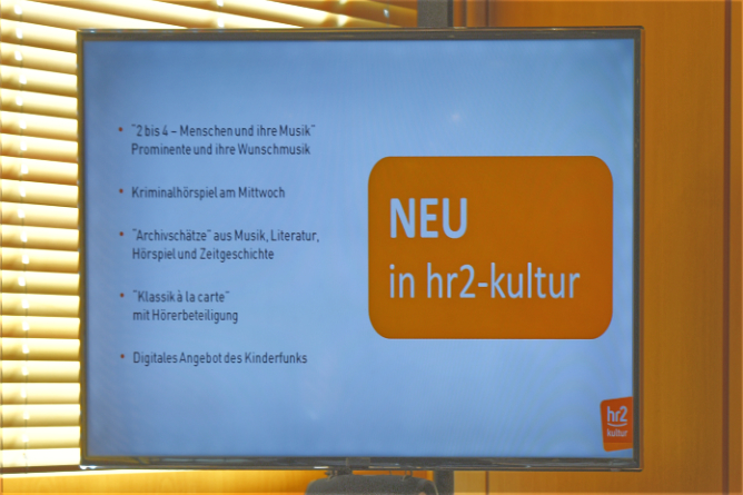 „Neu im Programm haben wir 2 bis 4 – Menschen und ihre Musik und stellen in diesem Format Prominente und ihre Wunschmusik vor. Auch das Kriminalhörspiel an jedem zweiten Mittwoch ist eine Novität“, erläuterte Sarkowicz. So werde am 14. Oktober ein hr-Radio-Tatort von Martin Mosebach ausgestrahlt.