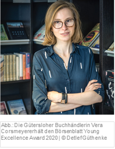 Der Börsenblatt Young Excellence Award geht in diesem Jahr nach Gütersloh. Vera Corsmeyer führt dort die Geschäfte der Buchhandlung Markus, die 2019 mit dem Deutschen Buchhandlungspreis als „Besonders herausragende Buchhandlung“ ausgezeichnet wurde. Sie hat eine eigene Literaturkolumne und bindet die Kunden unter anderem mit Veranstaltungen und Social-Media-Aktivitäten an ihr Sortiment.