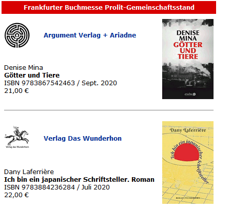 Mehr als 60 Verlage präsentieren sich auf der Prolit-Homepage mit ihren Herbst-Spitzentiteln. Sabine Klees vom Prolit-Vertriebs-Team: „Eine Buchmesse ohne Stände, aber trotzdem Präsenz zeigen:  Wir wollen den unabhängigen Verlagen in unserer Auslieferung mehr Sichtbarkeit verschaffen! Auch, aber nicht nur, für die Dauer der digitalen Frankfurter Buchmesse. Dafür nutzen wir etwa ein Drittel unserer Homepage www.prolit.de, Newsletter, zahlreiche links und digitale ‚Gimmicks‘ , ‚my bookfair‘ , Instagram und  Facebook.“
