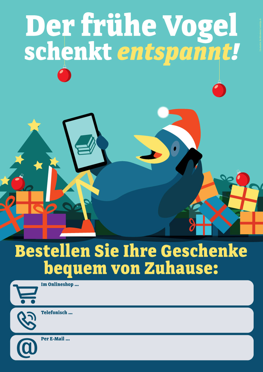 Buchwert stellt das Paket, bestehend aus Plakaten, einer Postkarte inkl. Wunschzettel zum Ausfüllen sowie Online-Banner für die Kommunikation per Newsletter, in den Sozialen Medien oder im Webshop, kostenlos zur Verfügung. „So können unsere Buchhandlungen ihren Kund*innen jetzt auf allen Kanälen zeigen, dass sie der beste Geschenke-Lieferant mit Top-Services für Weihnachten sind“, erläutert Barbara Janßen, Buchwert-Regionalbetreuerin. „Und die Postkarte haben wir im A5-Format auf 300g Papier gedruckt. Das fällt auf, wenn man diese den Kunden im Laden mitgibt. Und außerdem kann diese im Einzugsgebiet der Buchhandlungen in die Briefkästen verteilt werden“ ergänzt Simone Bücker aus dem Buchwert Marketing-Team.