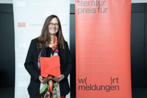 Verleihung: Kathrin Röggla nimmt WORTMELDUNGEN-Literaturpreis entgegen