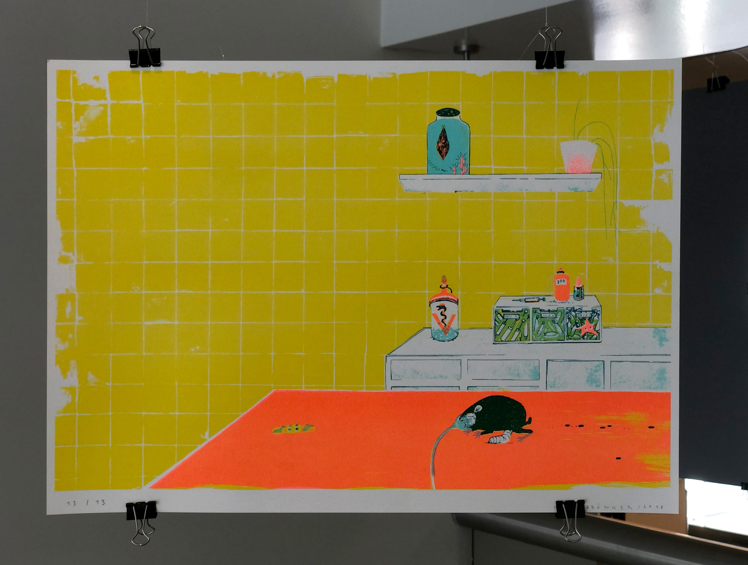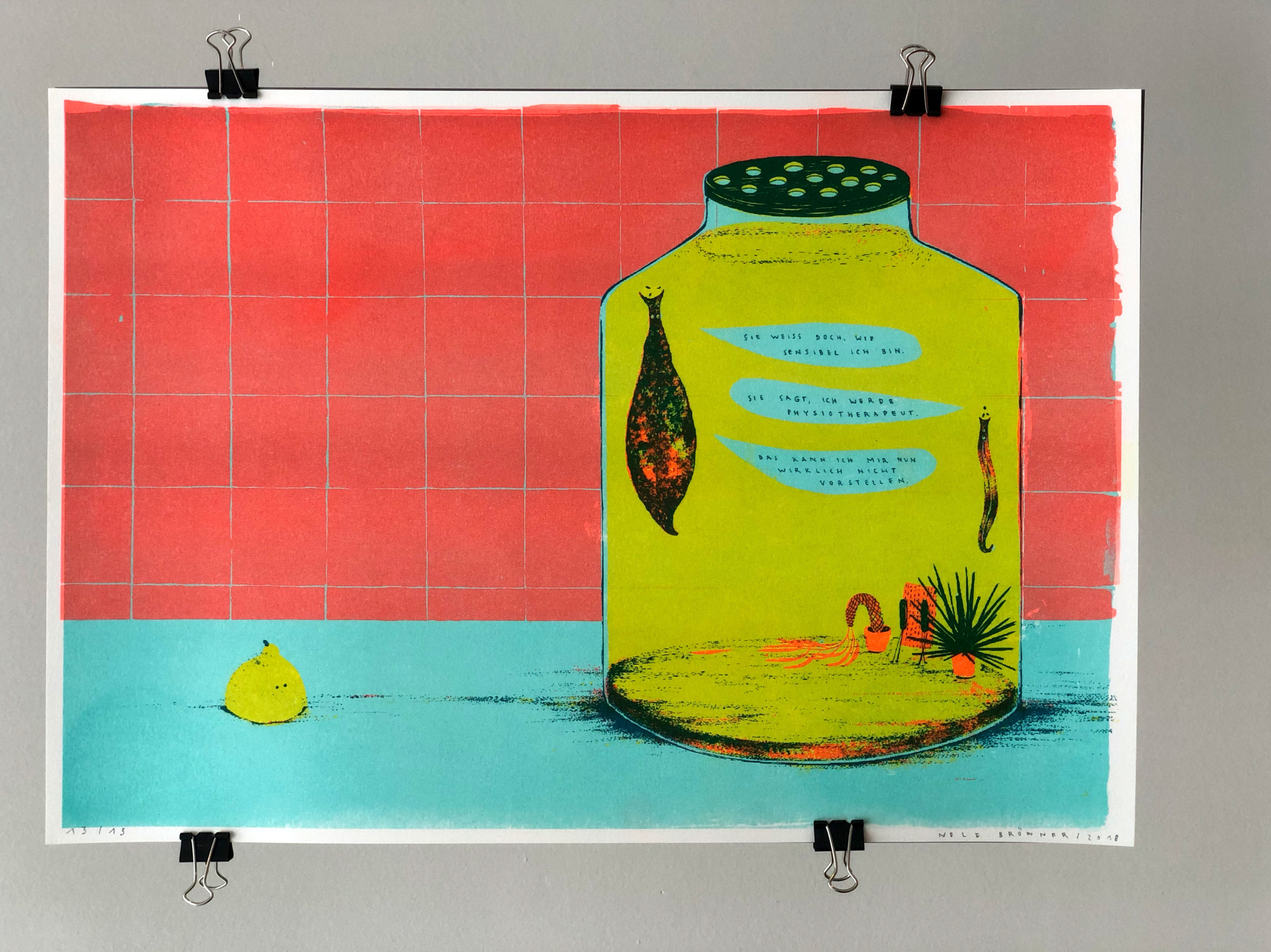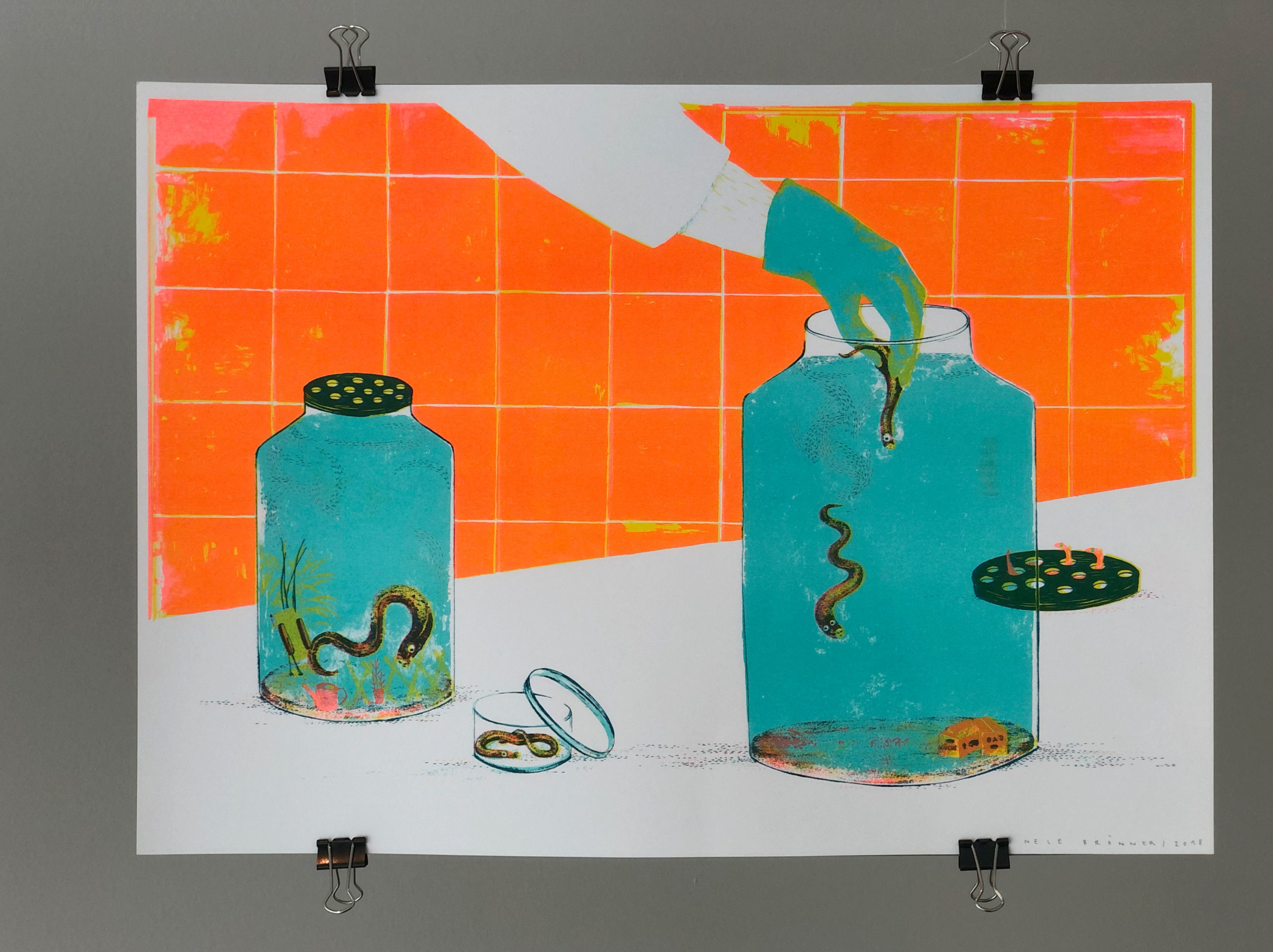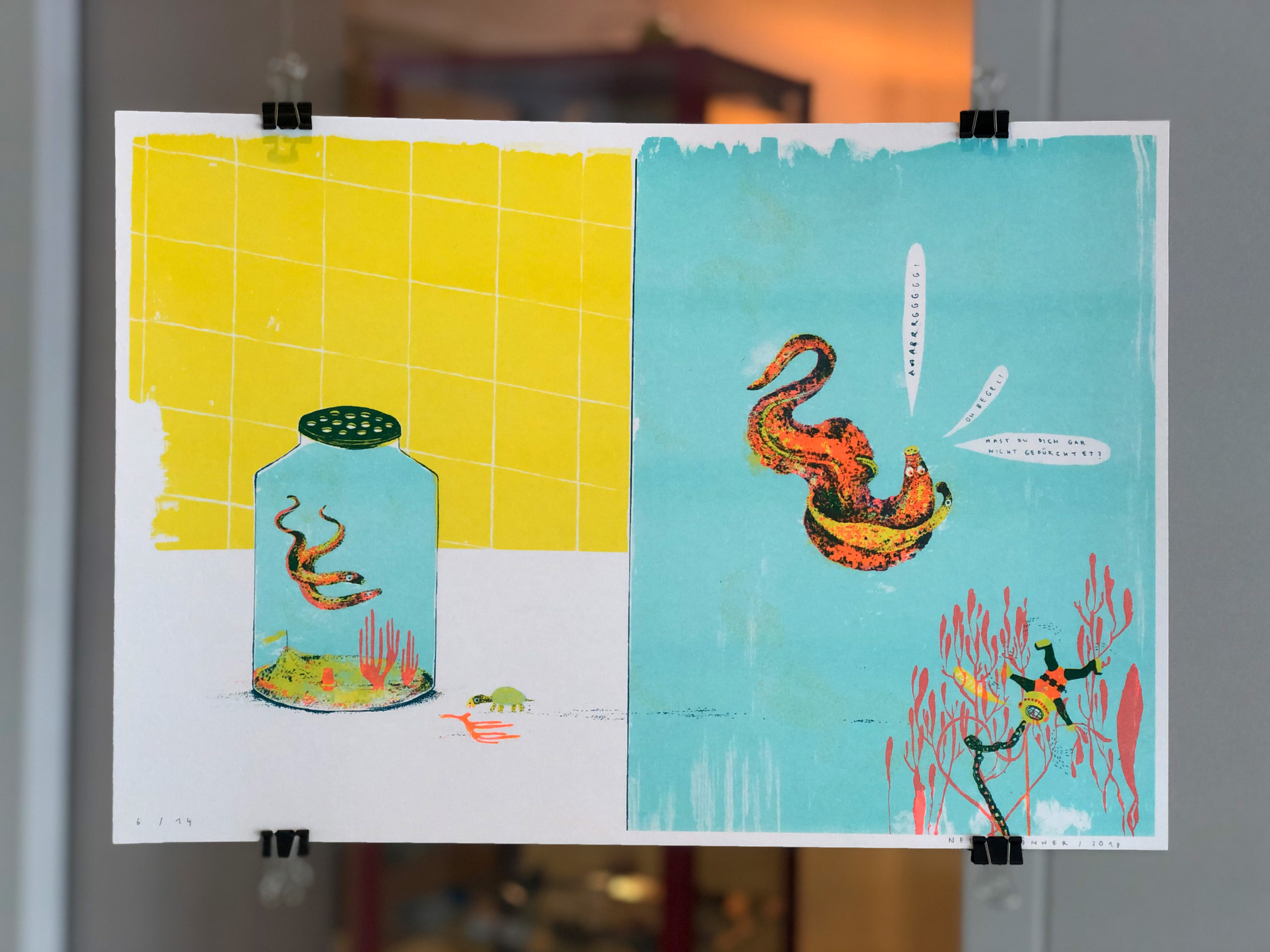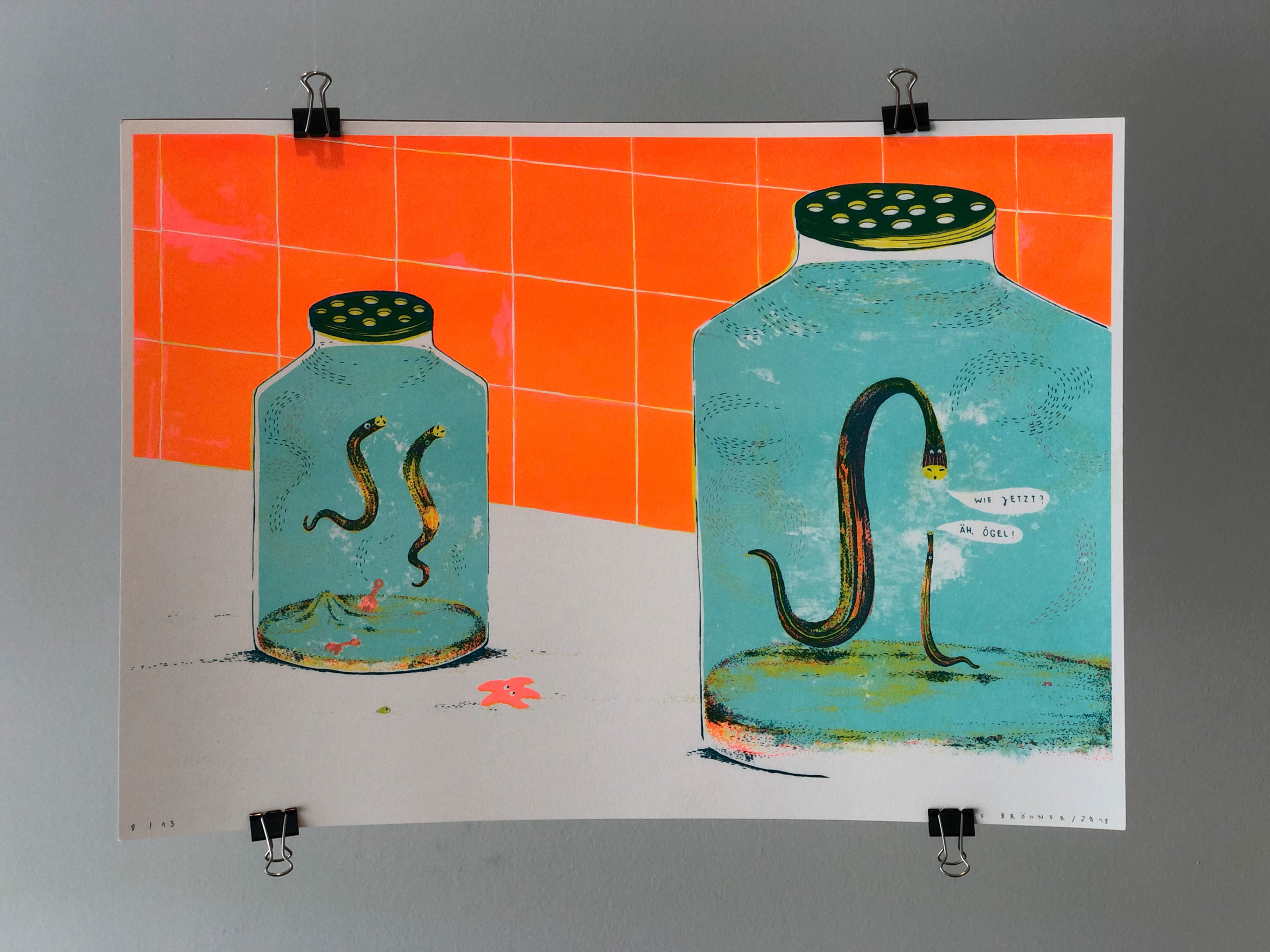Die in vier Sonderfarben gedruckten Risoprints haben alle ein Format von 42 x 30 cm, sind signiert und in limitierte Auflage von 10 bis 14 Stück gedruckt. Ausnahme ist der Druck „Labor“, den es 33 Mal gibt. Alle Drucke sind Auszüge aus meinen Buch Begel, der Egel, das 2018 beim sympathischen Luftschacht Verlag in Wien erschien. Ich verkaufe alle Drucke für 50 Euro plus 4 Euro Versandkosten und natürlich auf Rechnung, Mehrwertsteuer inklusive. Bitte Anfragen per Mail direkt an mich schicken: huhu@nelebroenner.com