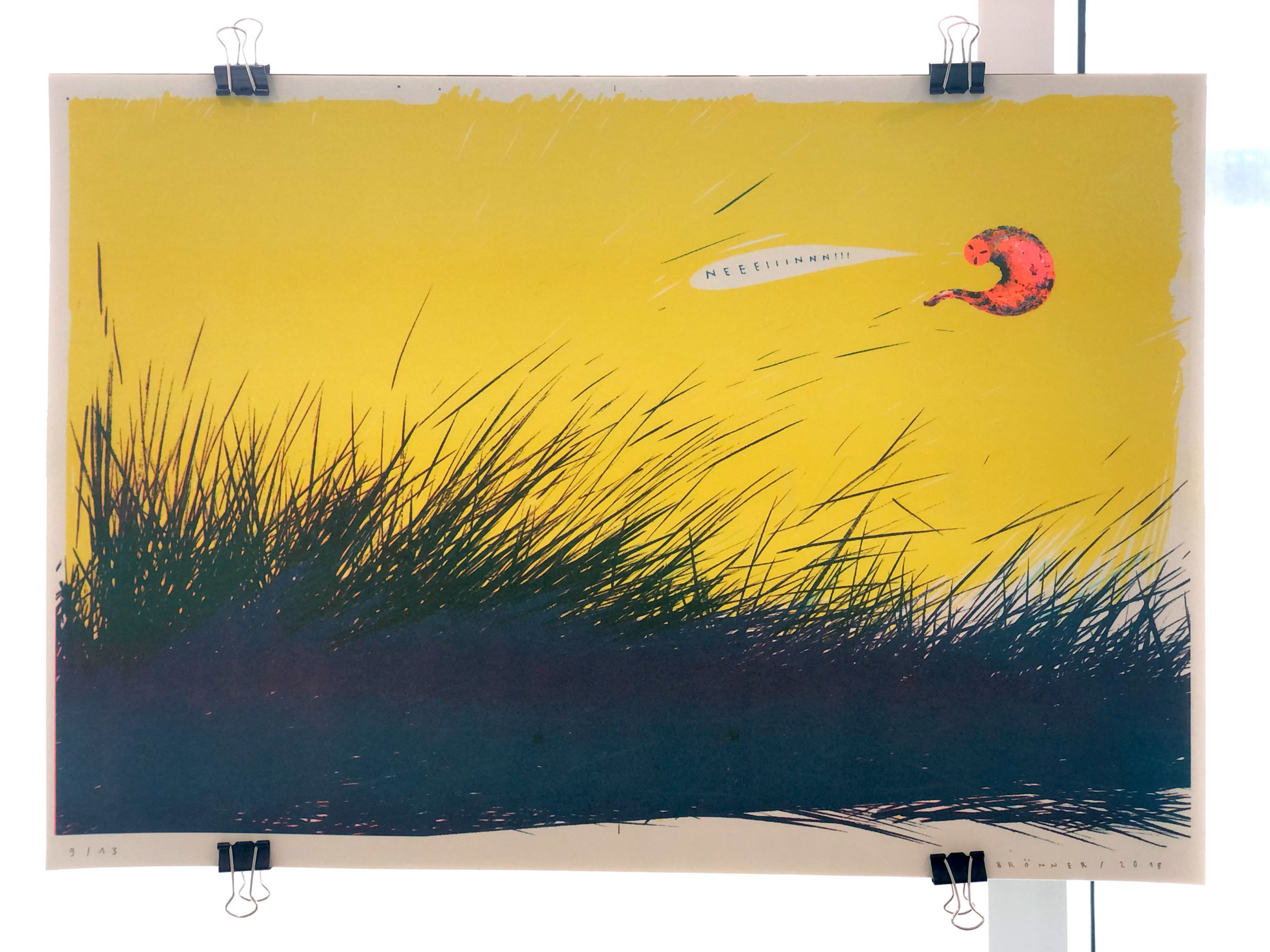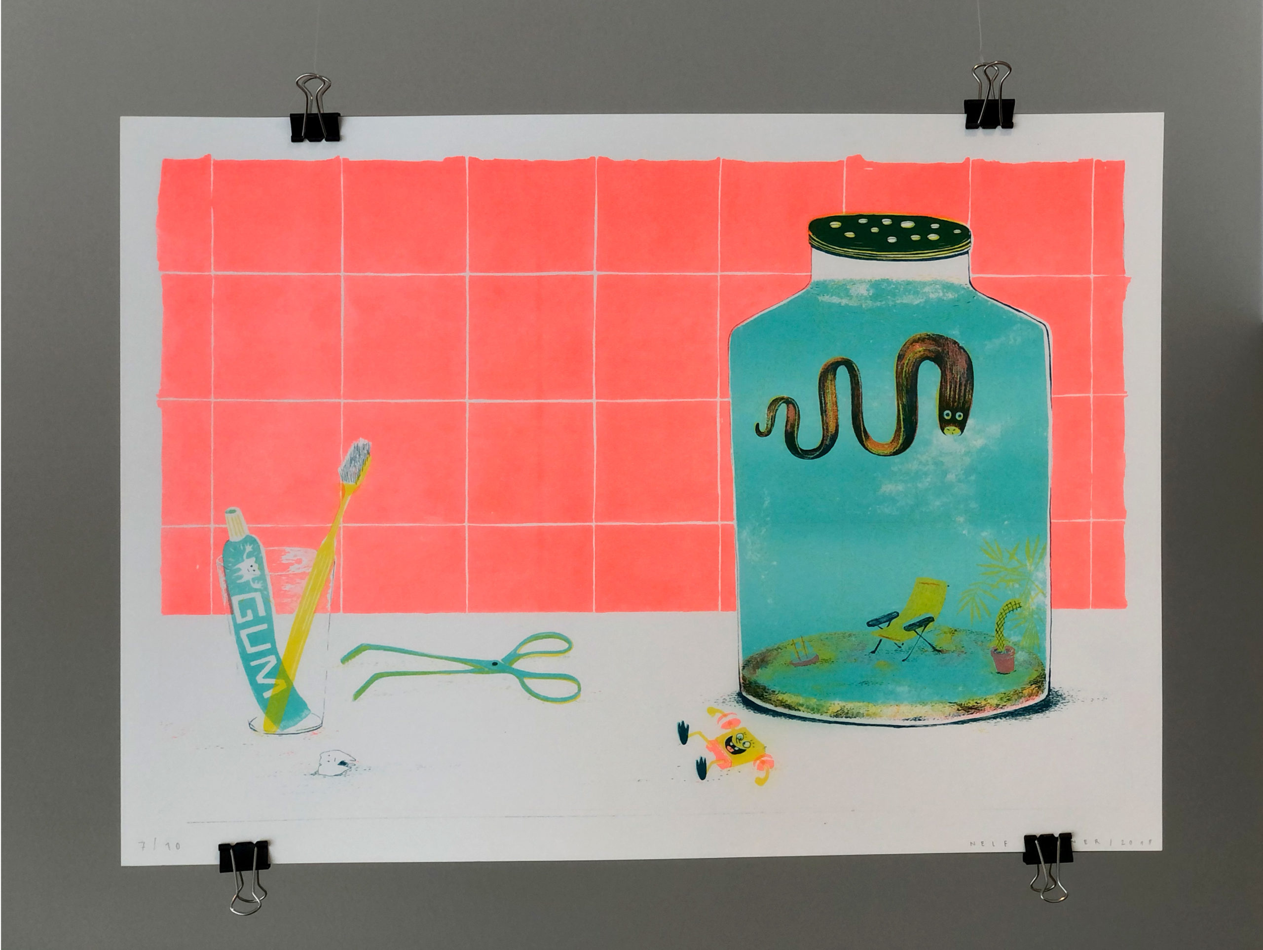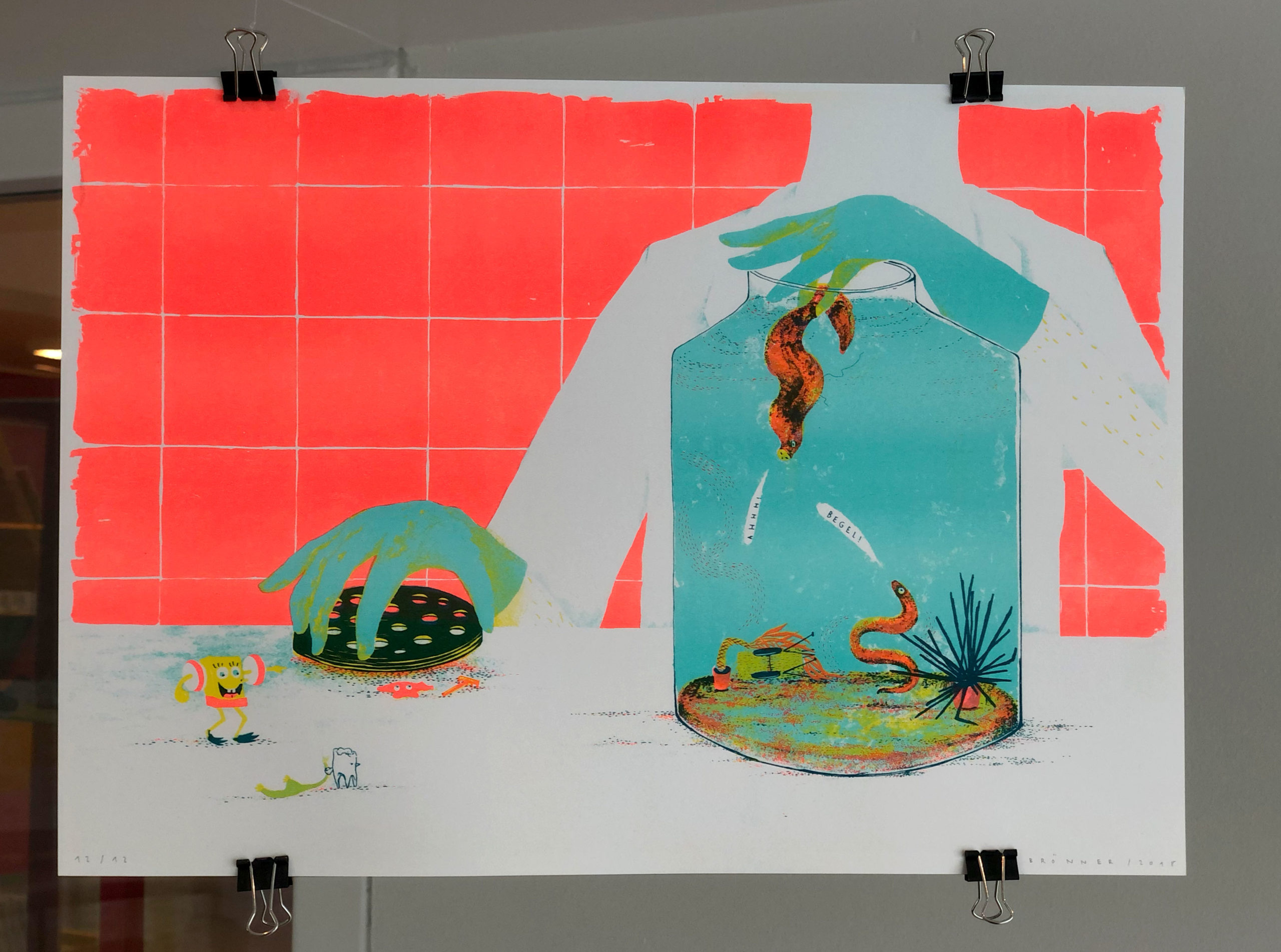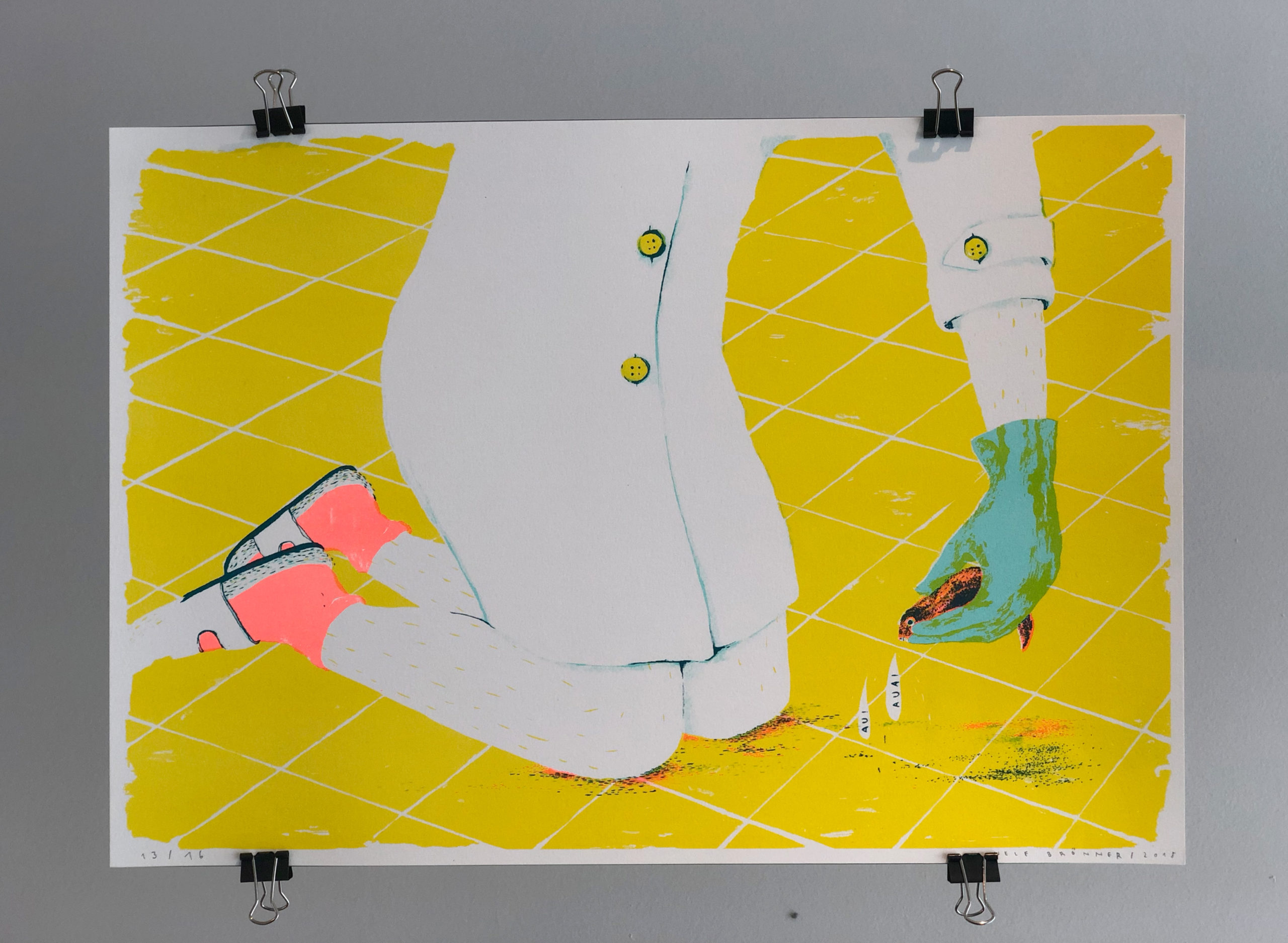 Die in vier Sonderfarben gedruckten Risoprints haben alle ein Format von 42 x 30 cm, sind signiert und in limitierte Auflage von 10 bis 14 Stück gedruckt. Ausnahme ist der Druck „Labor“, den es 33 Mal gibt. Alle Drucke sind Auszüge aus meinen Buch Begel, der Egel, das 2018 beim sympathischen Luftschacht Verlag in Wien erschien. Ich verkaufe alle Drucke für 50 Euro plus 4 Euro Versandkosten und natürlich auf Rechnung, Mehrwertsteuer inklusive. Bitte Anfragen per Mail direkt an mich schicken: huhu@nelebroenner.com