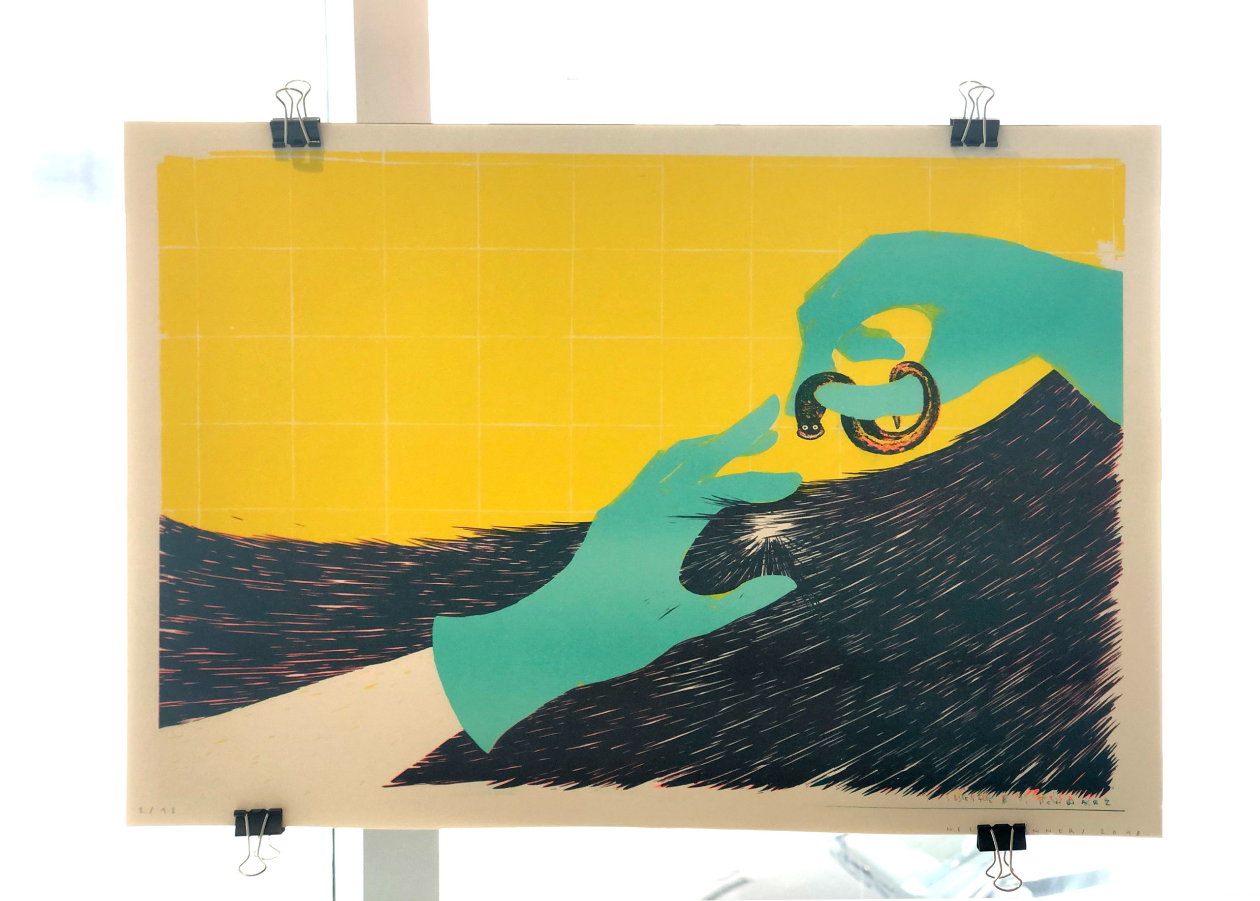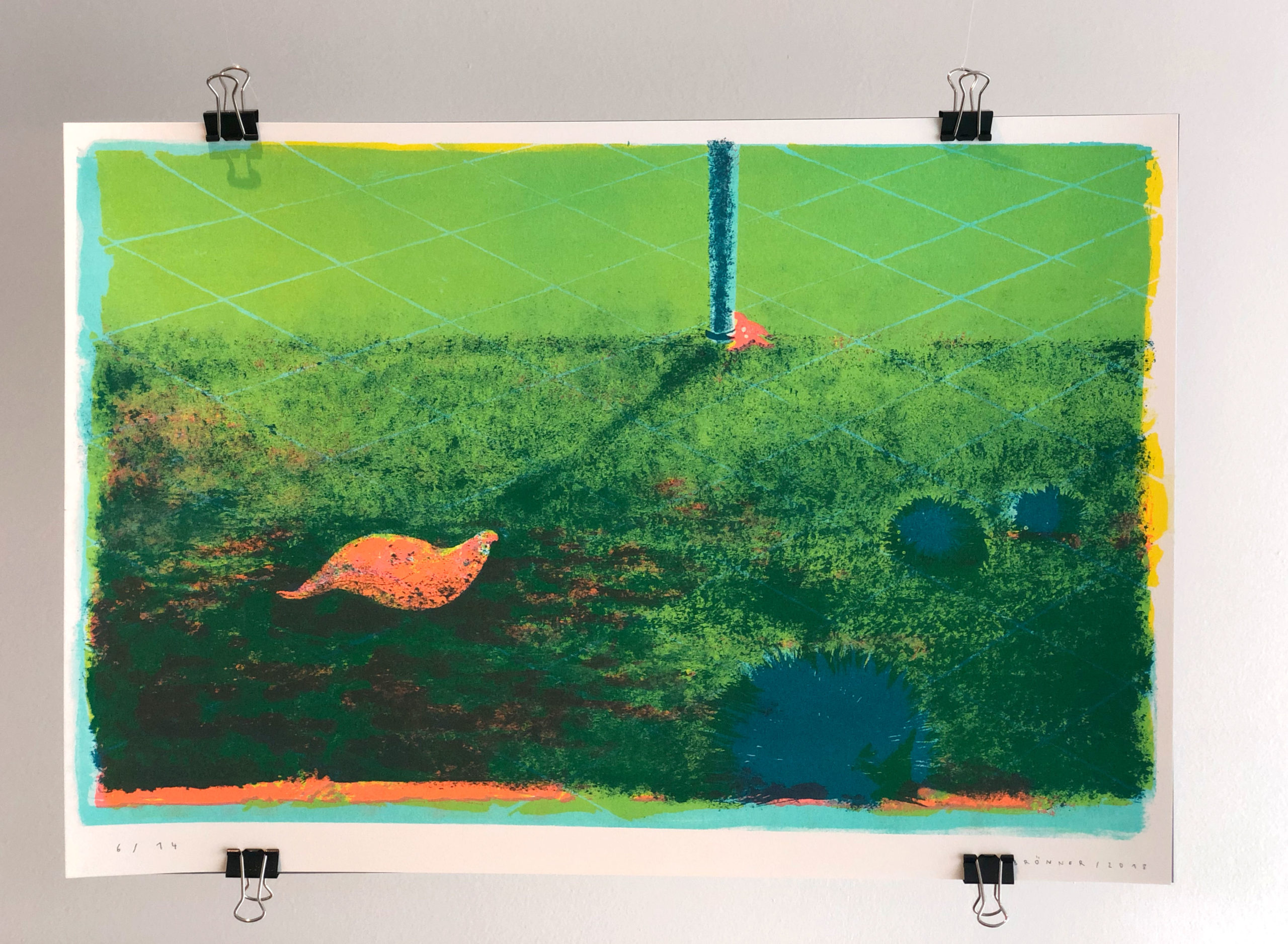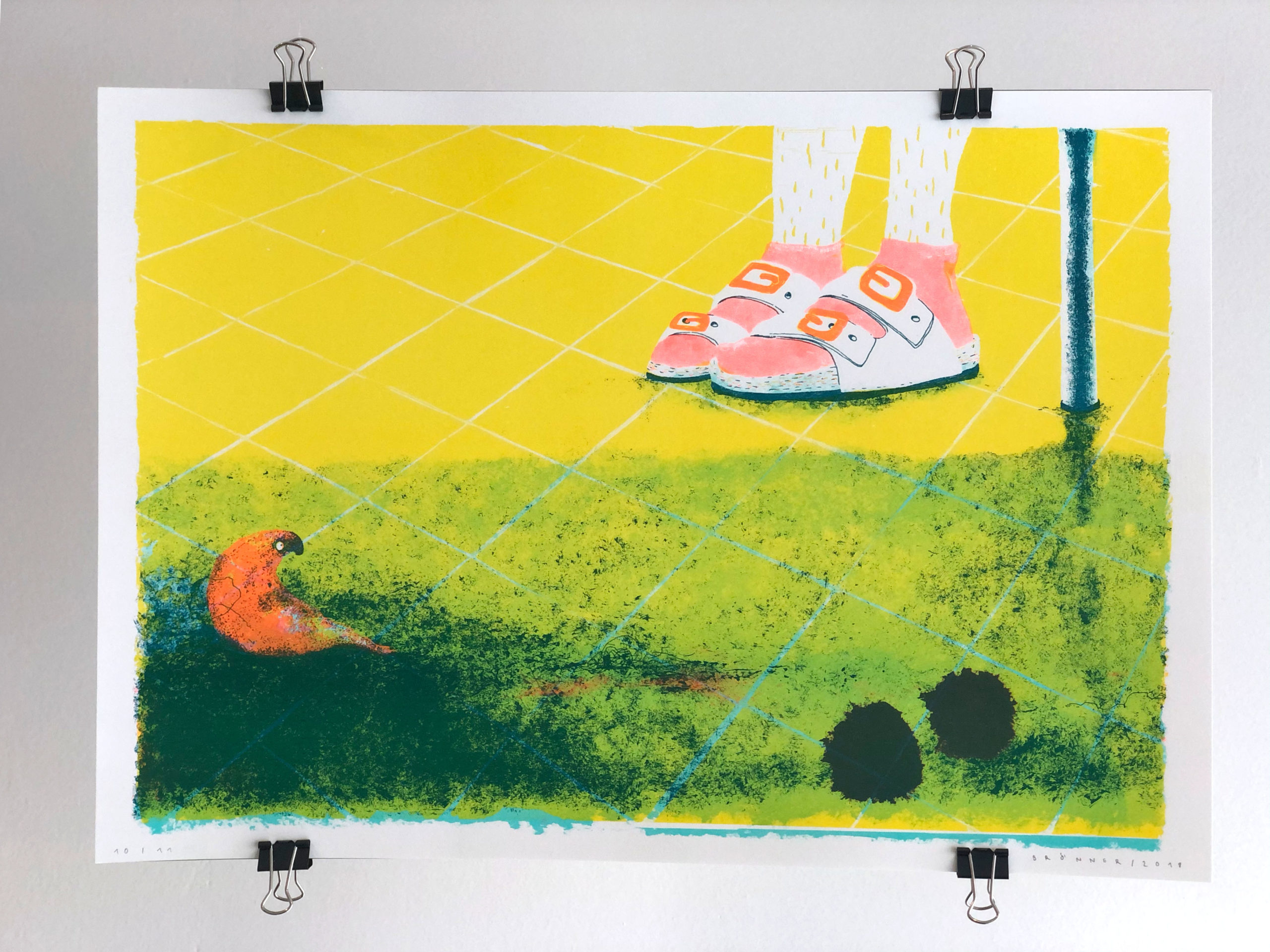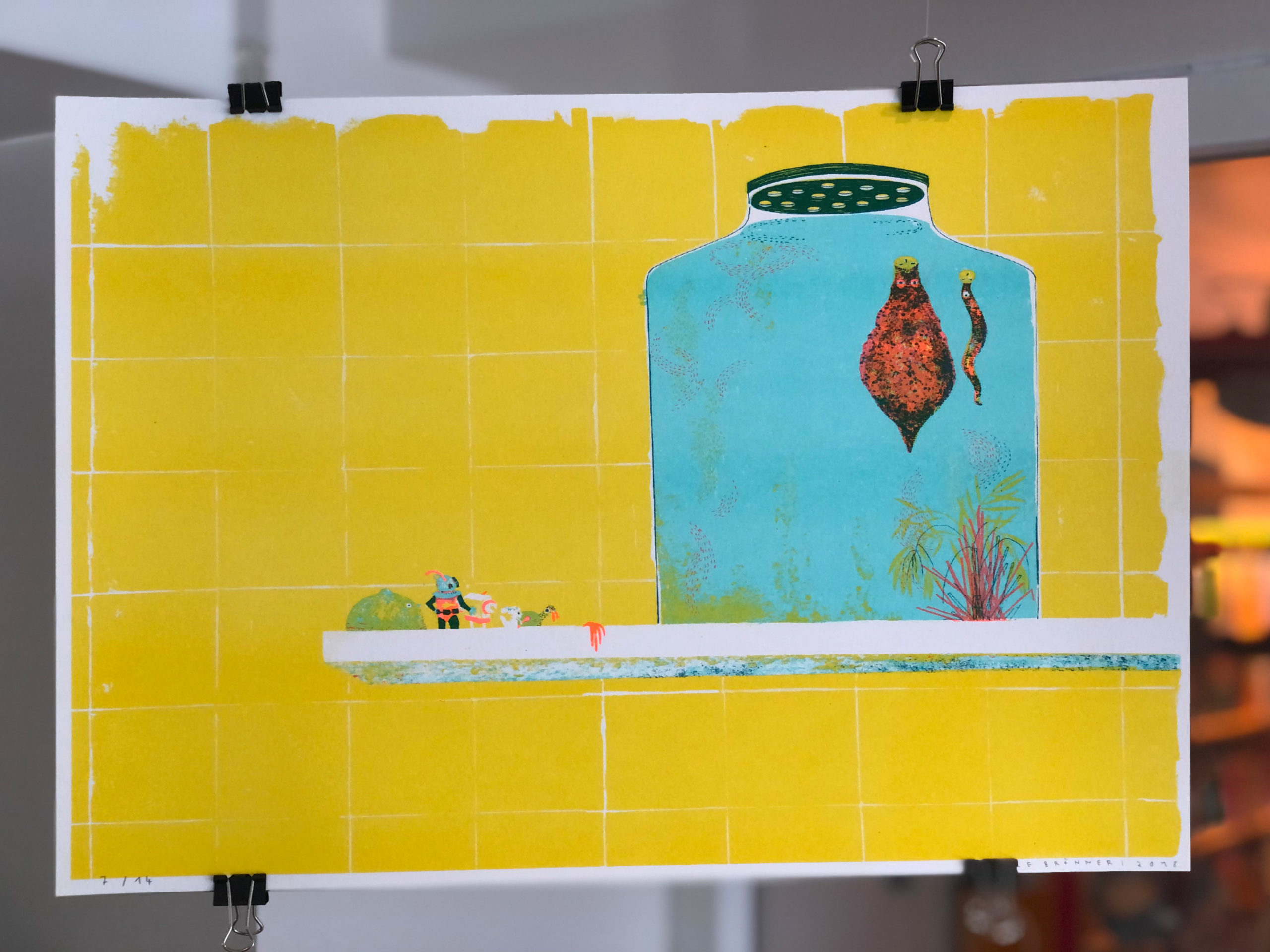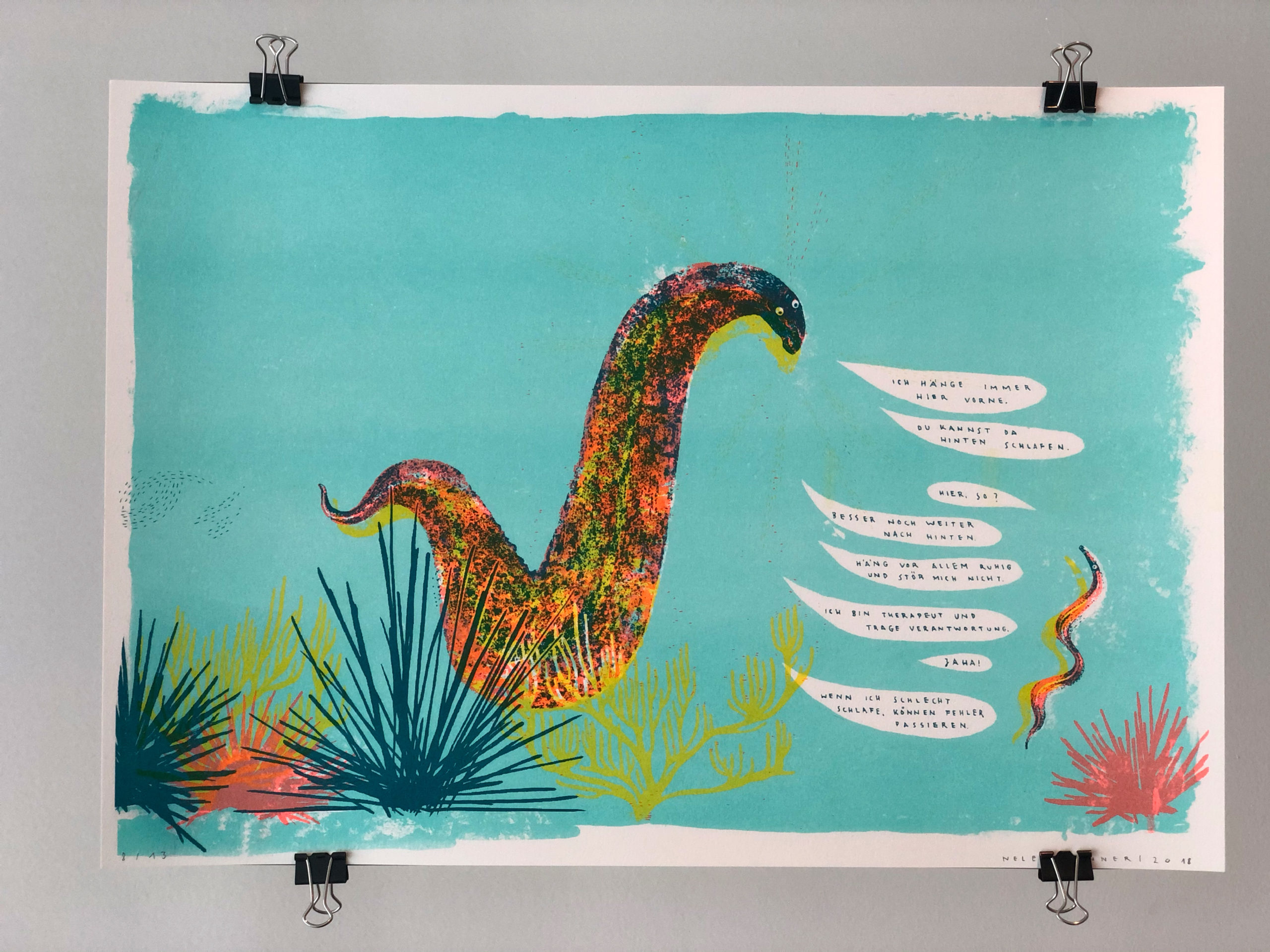 Die in vier Sonderfarben gedruckten Risoprints haben alle ein Format von 42 x 30 cm, sind signiert und in limitierte Auflage von 10 bis 14 Stück gedruckt. Ausnahme ist der Druck „Labor“, den es 33 Mal gibt. Alle Drucke sind Auszüge aus meinen Buch Begel, der Egel, das 2018 beim sympathischen Luftschacht Verlag in Wien erschien. Ich verkaufe alle Drucke für 50 Euro plus 4 Euro Versandkosten und natürlich auf Rechnung, Mehrwertsteuer inklusive. Bitte Anfragen per Mail direkt an mich schicken: huhu@nelebroenner.com