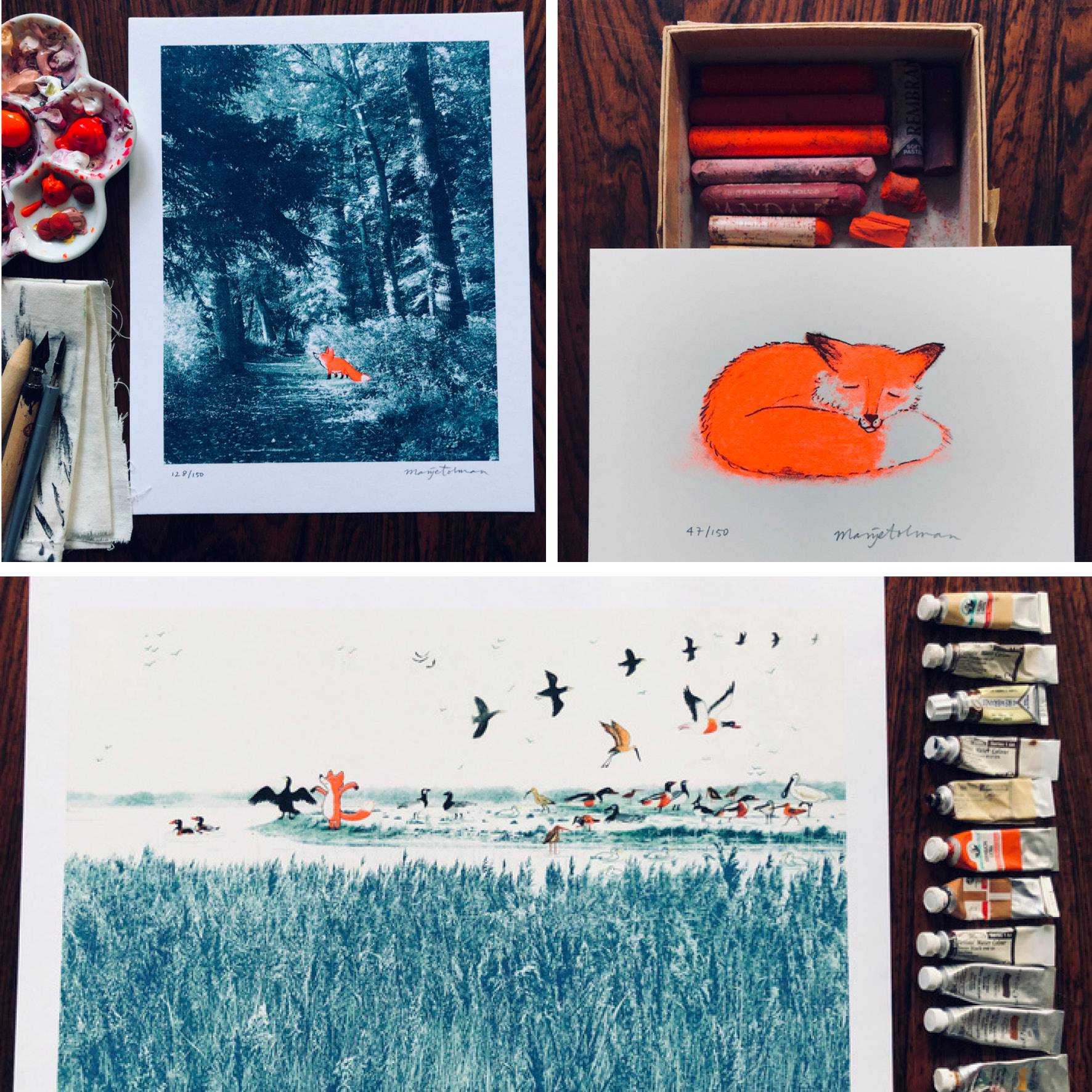 In der heutigen Folge unserer Reihe Schöner arbeiten im Home-Office – #bleibzuhausabermitkunst stellen wir die niederländische Künstlerin Marije Tolman vor. Sie bietet wunderschöne Risoprints aus dem Buch Der kleine Fuchs (Gerstenberg, Text: Edward van de Vendel) an, die Sie über ihre Website beziehen können. Das leuchtende Orange hilft garantiert gegen den Winterblues.