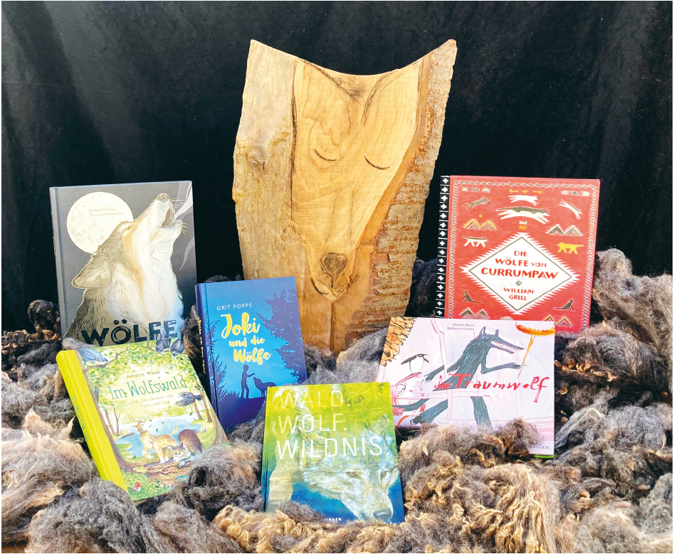 Manchmal sieht man ein Stück Holz und erkennt sofort ein Gesicht darin. So war es bei dem hier gezeigten, es war ein träumender Wolf. Es fehlten nur noch wenige Striche mit Pastellkreide und eine Stütze, die mittels eines Holzklotzes, zweier Winkel und einiger Schrauben an der Rückseite montiert wurde. Sicher entdecken Sie beim nächsten Waldspaziergang auch einen Wolf – oder ein ganz anderes Tier, das zu einem ganz anderen Büchertisch führt. Insbesondere in Nadelwäldern liegt derzeit leider viel Totholz herum. Hauptsache, Sie haben einen Beutel dabei.
