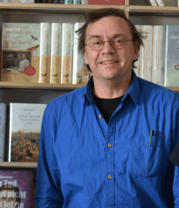 Rasmus Schöll, Inhaber der Aegis Buchhandlung in Ulm, wehrt sich
