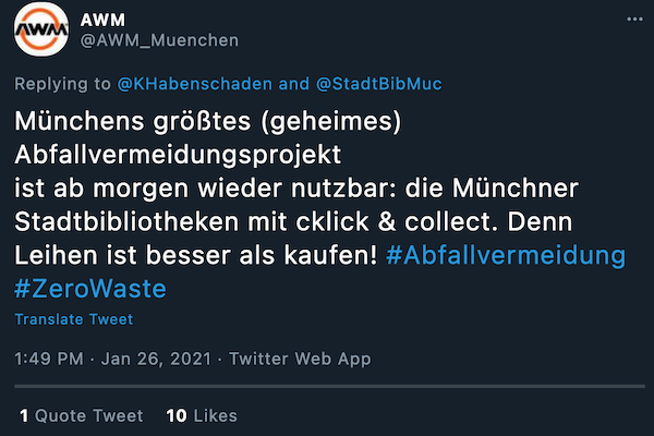 Gut gemeint gefällt nicht immer allen, uns jedenfalls nicht so recht: „Als ob der Buchhandel es heutzutage nicht eh schon schwer genug hätte“, sagt Dorin Popa. Der Münchner Journalist hat auf Twitter diesen Post von Münchens Abfallbetrieb AWM entdeckt, für den der Kauf von Büchern offenbar vermeidbarer Abfall ist: