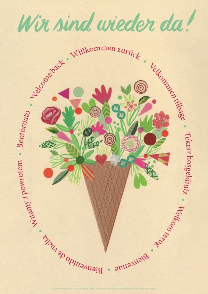 „Willkommen zurück“, heißt es in 9 Sprachen auf dem Plakat, das das Verlagshaus Jacoby & Stuart gern an alle interessierten Buchhandlungen verschickt. Das Motiv ist einer Illustration von Larissa Bertonasco aus Gelato! Gelato! Die besten italienischen Eisrezepte entnommen. Der Titel erscheint am 29. März.