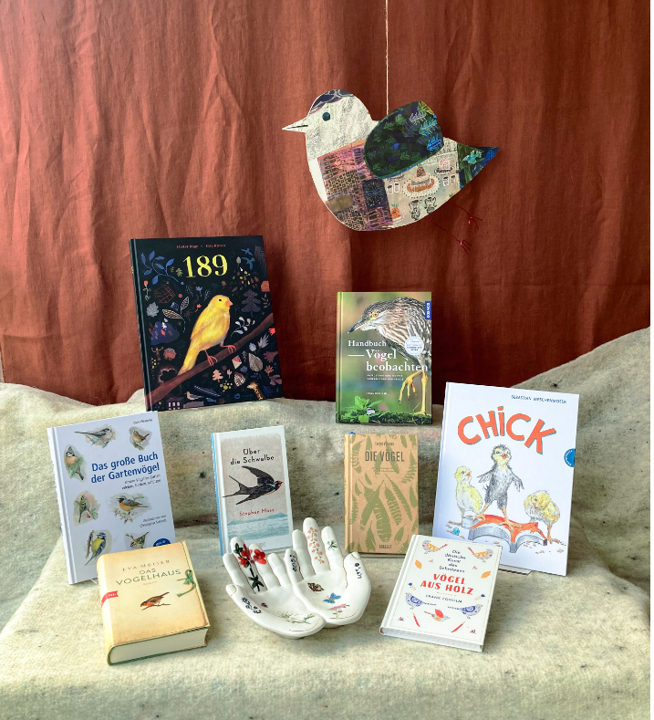 Einen Gedichtband von ihr kann auf einem Büchertisch über die Welt der Vögel gleich dazustellen. Als Material für den collagierten Papp- Vogel lassen sich gut alte Vorschauen verwenden. Wer keine Schale wie die hier verwendete von Nathalie Lété zur Hand hat, kann ein Foto der eigenen Hand machen, es auf Karton im Farbdrucker ausdrucken und entsprechend beschneiden.