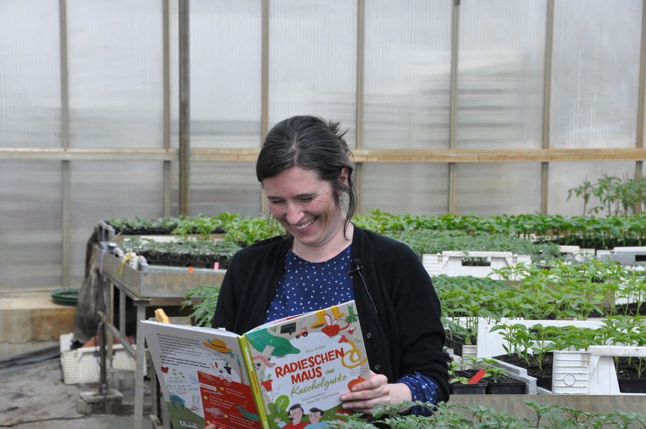 Morgen startet die Münchner Bücherschau junior – vorwiegend digital – mit vielen Online-Lesungen, -Workshops, digitalem Schmökern in der Buchausstellung und zahlreichen anderen Angeboten. Dafür war das Team u.a. vor wenigen Tagen für einen Lesungsdreh in der Familiengärtnerei von Autorin Miro Poferl vor den Toren von München zu Gast. Dort las sie aus ihrem Bilderbuch Radieschenmaus und Kuschelgurke (Edition Nilpferd). Das Vorlese- und Mitmachbuch führt in zwölf Geschichten durch das Garten-Jahr und bringt kleine (und große) Gärtner*innen auf den Geschmack von Radieschen, Seedbombs und essbaren Blüten.