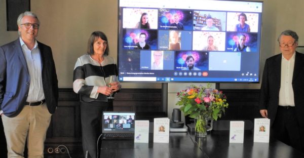 Den 80. Geburtstag von Monika Maron hat der Hoffmann und Campe Verlag gestern mit seiner neuen Autorin gefeiert. Das Bild zeigt, dass abe „Corona-konform“ gratuliert wurde: Die Mitarbeiterinnen und Mitarbeiter gratulierten virtuell, während Hoffmann und Campe-Eigentümer und Verleger Thomas Ganske (r. im Bild), der verlegerische Geschäftsführer Tim Jung und Monika Maron in der Heinrich-Heine-Villa an der Außenalster miteinander anstießen.