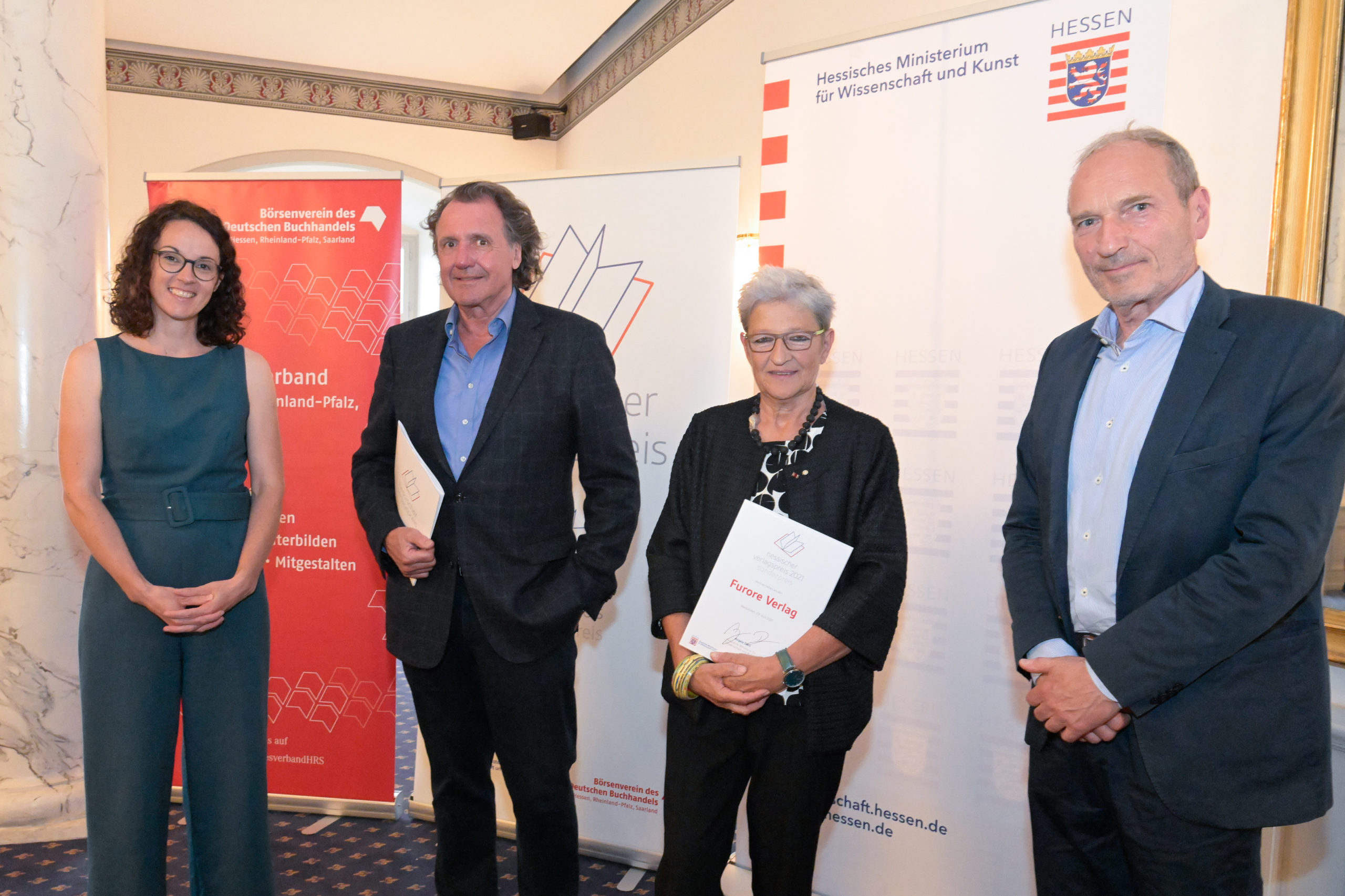 Kunst- und Kulturministerin Angela Dorn überreichte gestern im Schloss Bad Homburg in feierlichem Rahmen den Hessischen Verlagspreis. Der mit 15.000 Euro dotierte Hauptpreis ging an die Frankfurter Verlagsanstalt. Den Sonderpreis in Höhe von 5.000 Euro bekam der Furore Verlag. Der Hessische Verlagspreis wird seit 2018 gemeinsam mit dem Landesverband Hessen, Rheinland-Pfalz, Saarland des Börsenvereins des Deutschen Buchhandels e.V. vergeben.